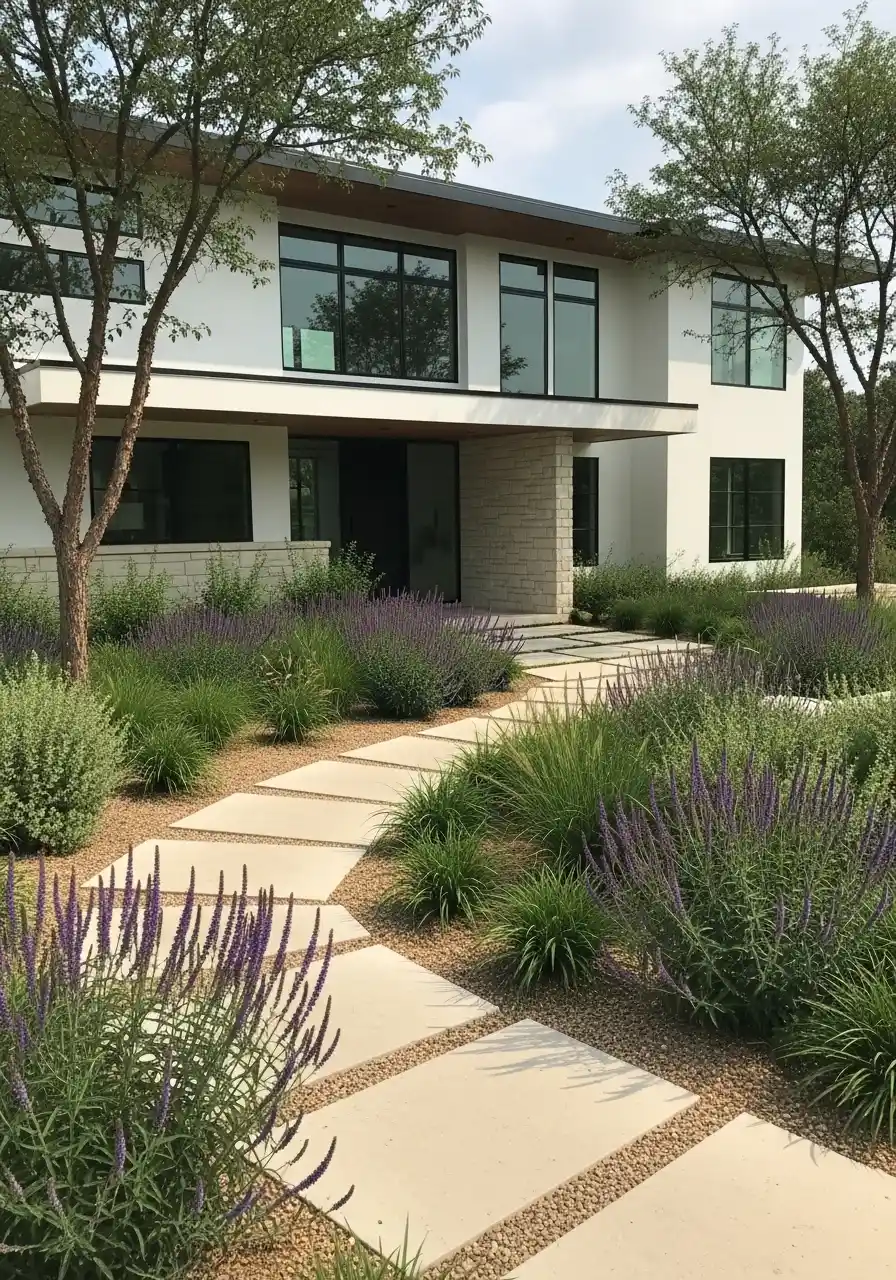 The plant palette is very restrained, which is exactly why it works. There are not twenty different flower colors fighting each other. Instead, you get repeated grassy forms and soft lavender-purple spikes. That repetition is soothing. It also makes the architecture stand out more. Good landscaping should support the house, not try to outshout it. This design gets that right, and I really admire it for that.