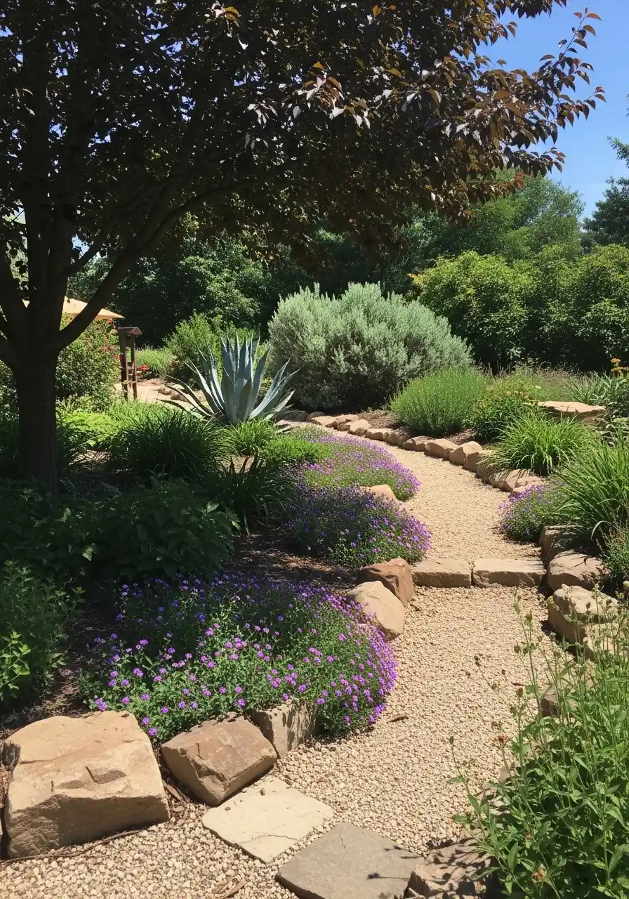 The fifth image feels more relaxed and organic. I honestly love this one because it is not trying too hard. The gravel path curves gently through shade, with purple groundcover, boulders, and mixed foliage. It has that tucked-away garden feeling that makes me want to walk slower and just stay there for a minute.