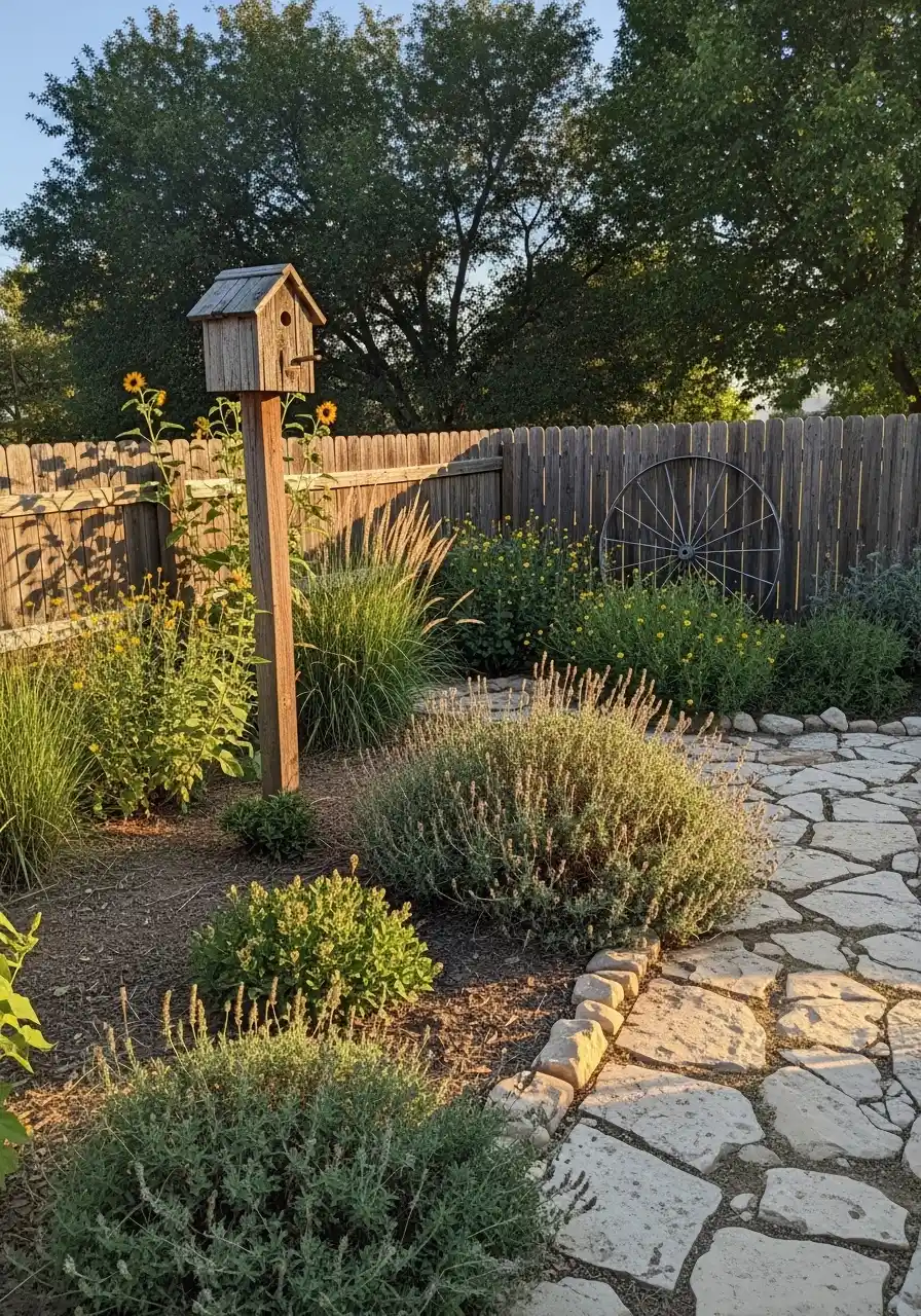 I would suggest this kind of setup for a backyard seating zone or a side patio that needs character. You do not need a huge budget. One garden feature like a birdhouse, old wheel, or bench can make it feel collected over time. That personal touch is why this image stuck with me, I cant lie.