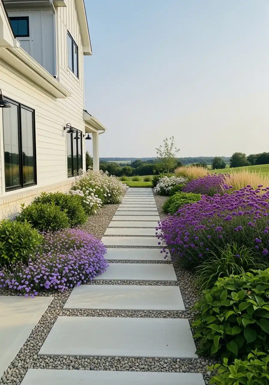 This would work especially well along the side of a house, where you want a strong visual corridor. I would just be careful with plant size over time. Some flowering perennials spread fast, and if they swallow the path edges, the clean look disappears. Still, as landscaping ideas for Nebraska homes with a newer exterior, this one is seriously good.