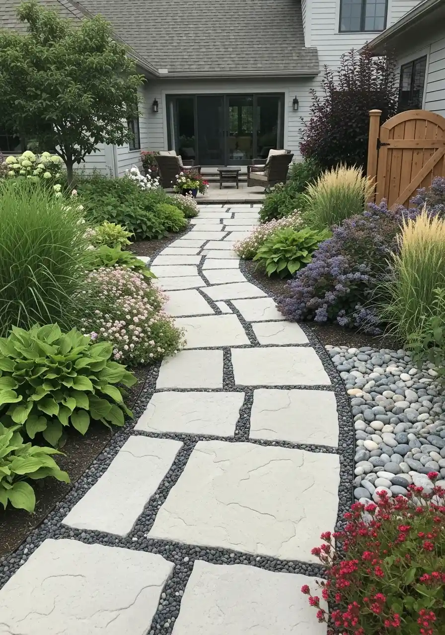 This is one of those landscaping ideas for Nebraska that works well for people who want a rich garden feel without making every inch complicated. The path itself carries a lot of the design. Because the stones are large, the layout already feels substantial. Then the pebble joints and planting do the detail work. It is balanced nicely.