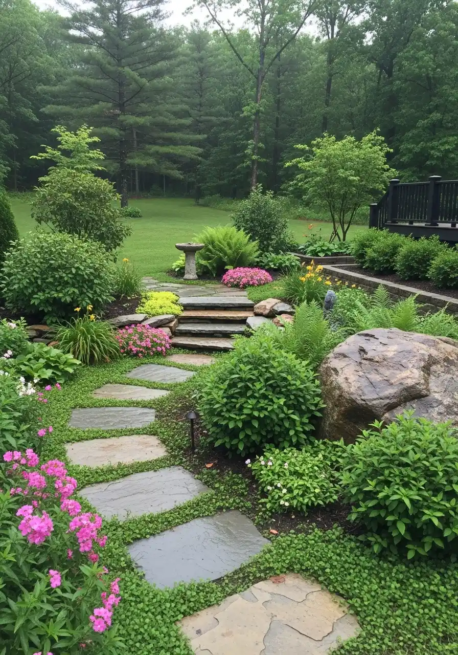 The stepping stones set into low green groundcover are what caught my eye first. It feels lush and soft, almost storybook pretty, but still grounded by the stone steps and larger boulders. The layered beds also help a sloped yard feel intentional. That is a big deal. Slopes can be awkward and annoying, and this turns them into an advantage.