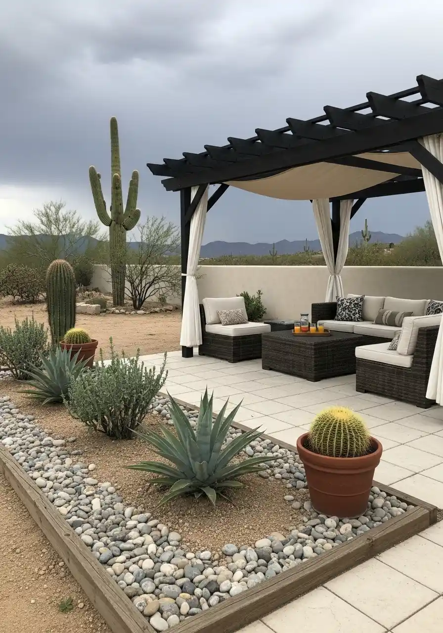 The image ends the set on a softer note. A pergola with curtains, outdoor seating, potted cactus, gravel, and clean planting beds makes the space feel calm and usable even under a cloudy sky. What I like most is that it doesn’t try too hard. It’s just a comfortable outdoor room framed by desert materials. That kind of design ages well, I think.