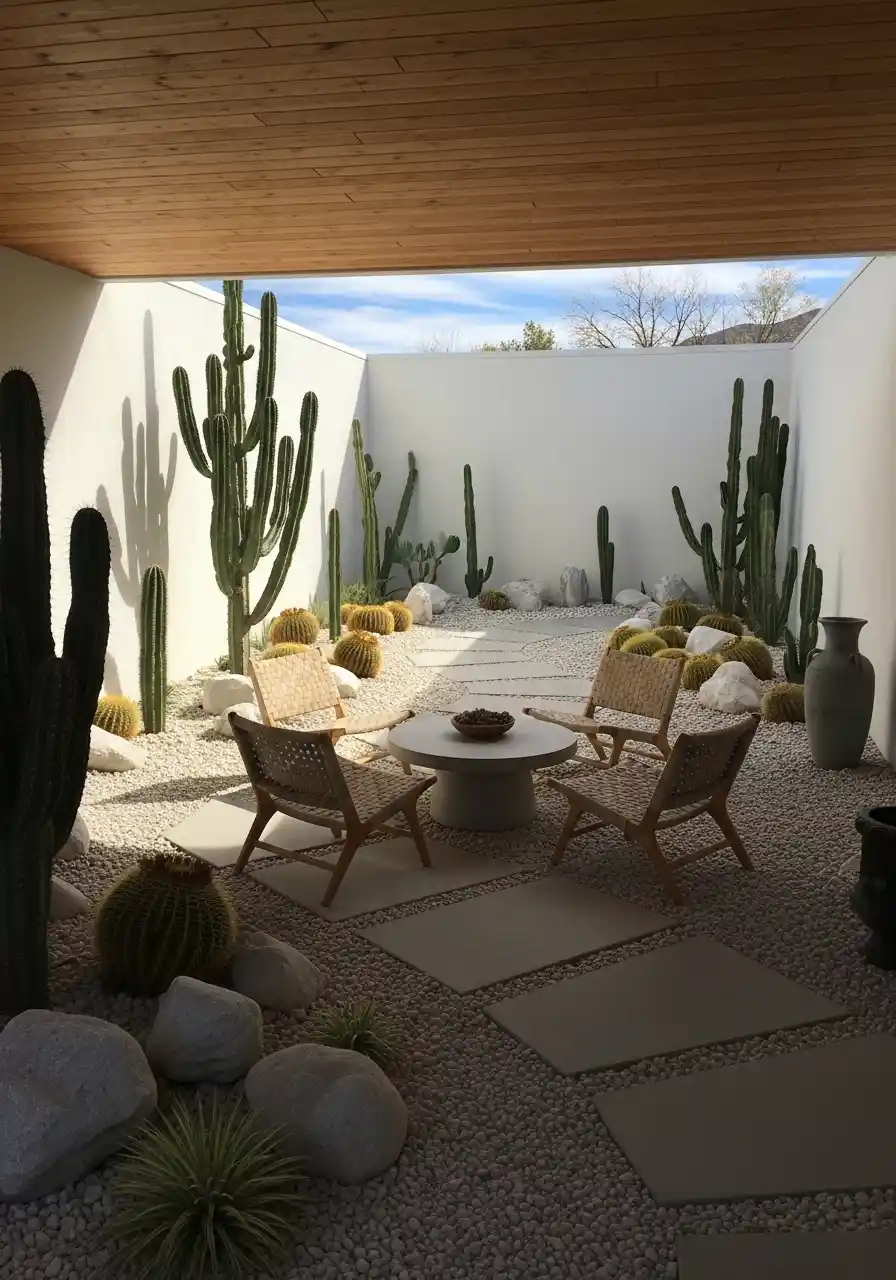 The image really hit me because it does something simple but kind of brave. It turns a small courtyard into a desert retreat by using white walls, cactus shapes, pale gravel, and a warm wood ceiling. I love how the seating area sits in the middle like a little island. It feels private, shaded, and almost silent. To me, this is one of the best landscaping ideas for northern nevada if you want a yard that feels like a room, not just outdoor leftover space.