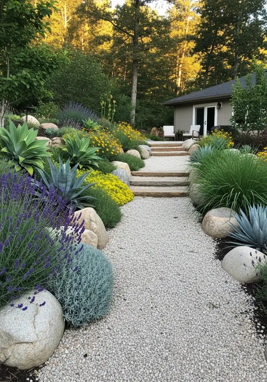 I really like how this layout guides your eye. It does not scream for attention. It just pulls you along, which is hard to do well. The mix of textures matters a lot here. Fine gravel, soft foliage, upright flower spikes, and smooth stone all balance each other. If I was planning a yard like this, I would borrow the layering trick. Put low plants in front, medium mounds in the middle, and taller grasses or shrubs farther back. That is one of my favorite xeriscape ideas for northern nevada because it gives fullness without needing a thirsty lawn.