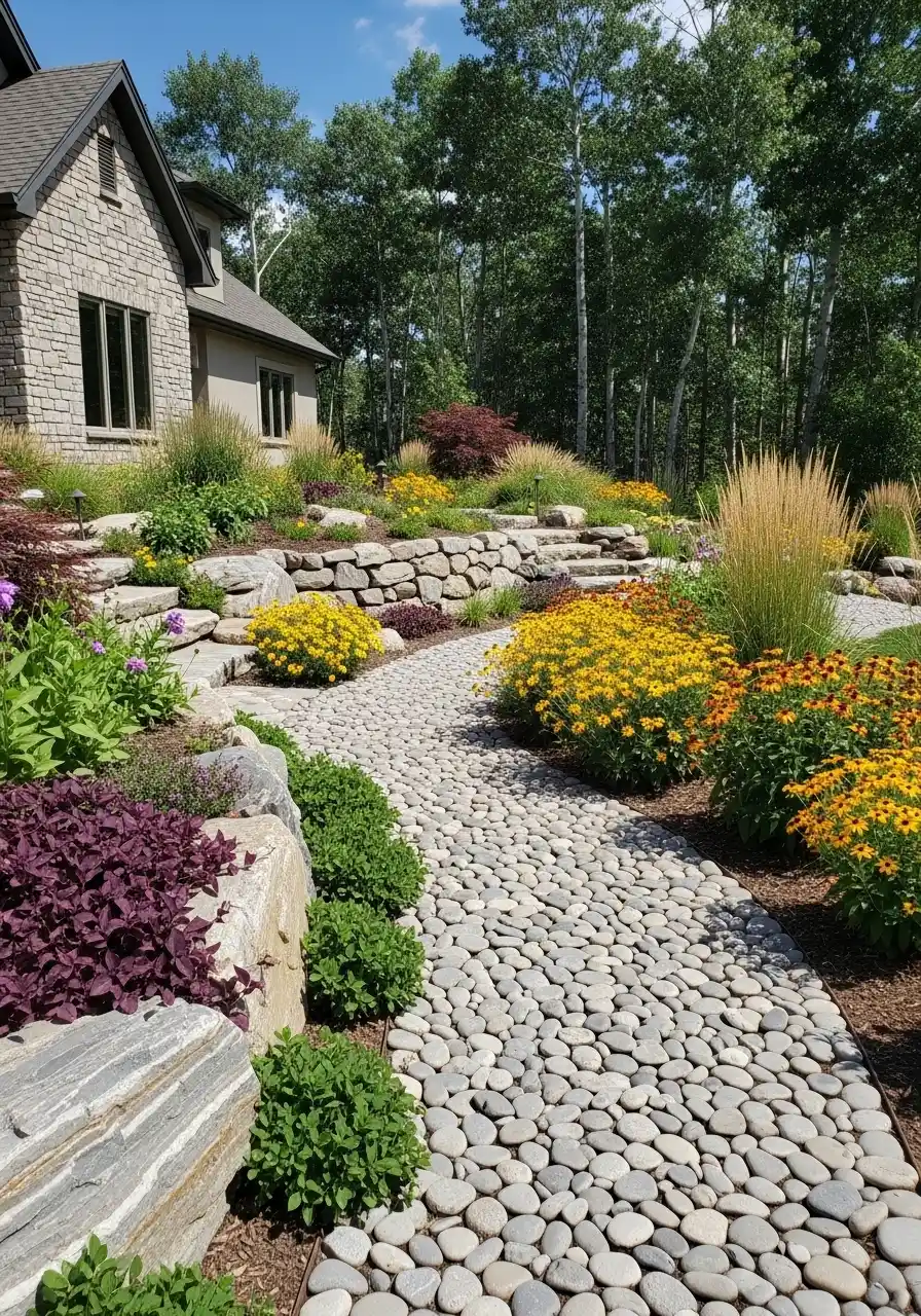 The image is more built-out, and I kinda love that. It has a curving pebble path, stacked stone walls, bright flowers, and ornamental grasses that sway around the edges. This is the kind of yard that feels mature, like it has been cared for over time. For homes on a slope, I think this is one of the strongest northern nevada front yard landscaping ideas because the retaining walls are not just useful, they become part of the beauty.