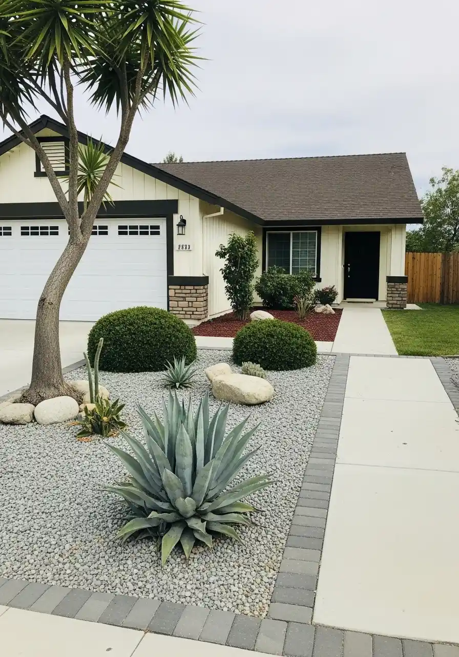 The image is simple, crisp, and almost foolproof. White gravel covers the planting bed, dark trim on the house adds contrast, and sculptural plants like agave and clipped shrubs keep the whole space clean. I think this is one of the easiest northern nevada landscaping ideas for people who want something neat without a ton of maintenance. There is not much clutter, and because of that, every plant matters more.