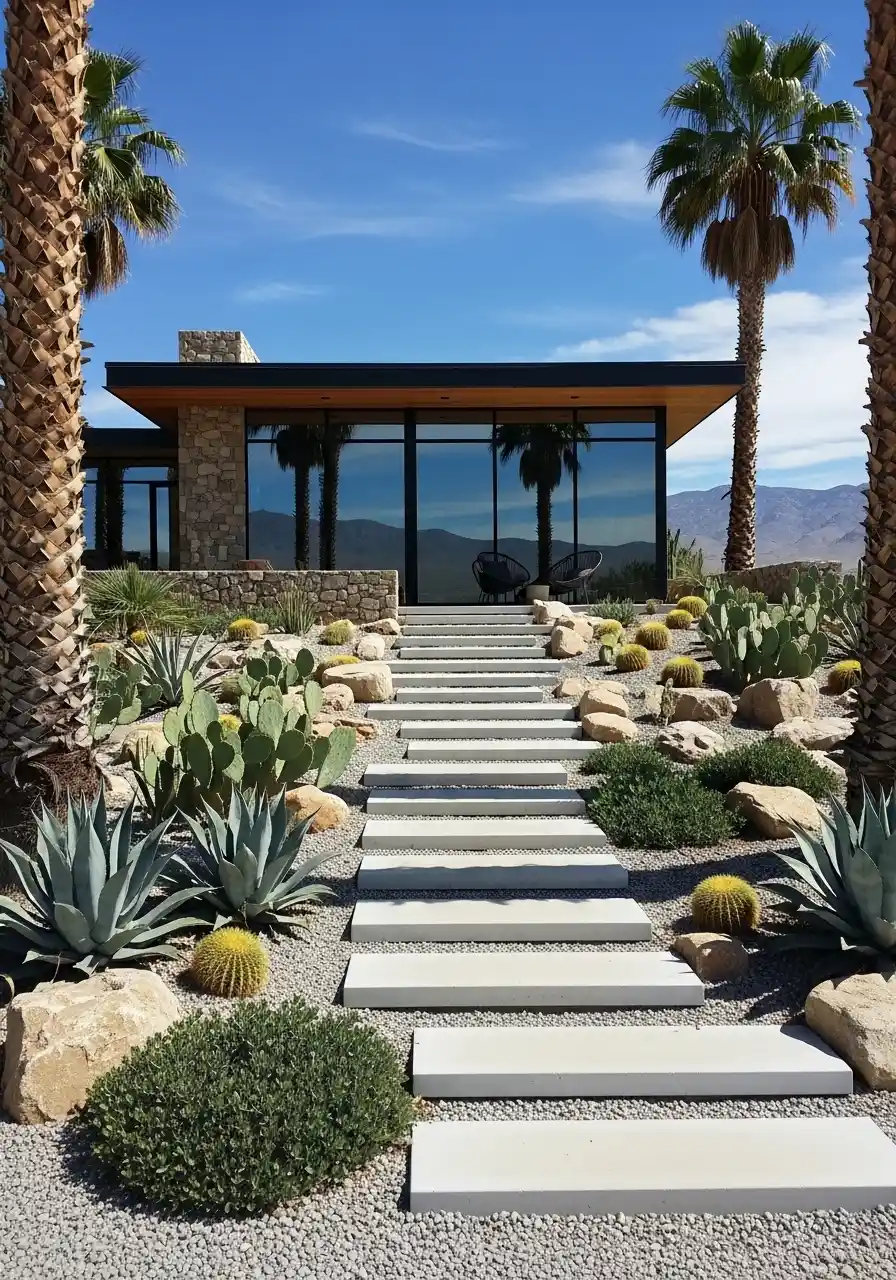 The image is dramatic in the best way. Tall palms frame the view, broad concrete steps pull you upward, and the planting around them uses agave, barrel cactus, prickly pear, and low shrubs. It feels expensive, yes, but also clear in its purpose. This is an arrival moment. You do not just walk to the house, you approach it. For bold homes, this is one of the most exciting northern nevada landscape ideas I can think of.