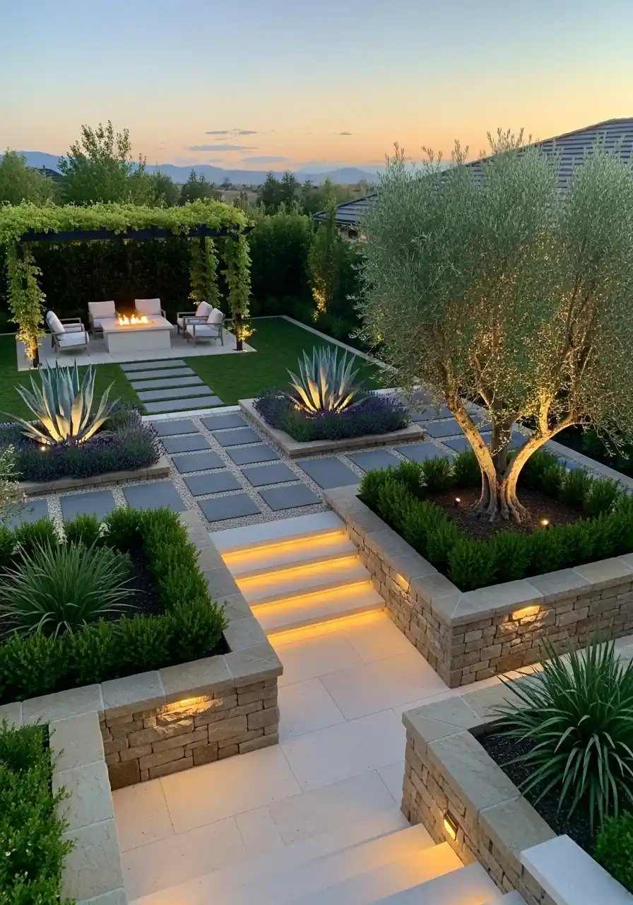 The image feels softer and more social. There is an outdoor seating area under a vine-covered pergola, raised planters, a central path, and warm built-in lighting on the steps and walls. This one speaks to me because it is not just pretty in daylight. It was clearly planned for real life after sunset. And that matters a lot. Good northern nevada backyard landscaping ideas should not stop working when the sun goes down.