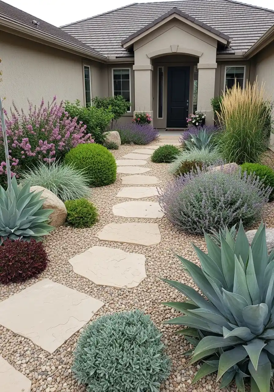 The image is probably one of the most practical for everyday people. It has a simple stepping-stone path through gravel, soft lavender tones, round green shrubs, tall ornamental grass, and bold agave shapes near the edges. I really like this one because it feels pretty without trying too hard. It does not look fussy. It just looks cared for. For smaller front entries, this is one of the most usable northern nevada landscaping ideas in the bunch.