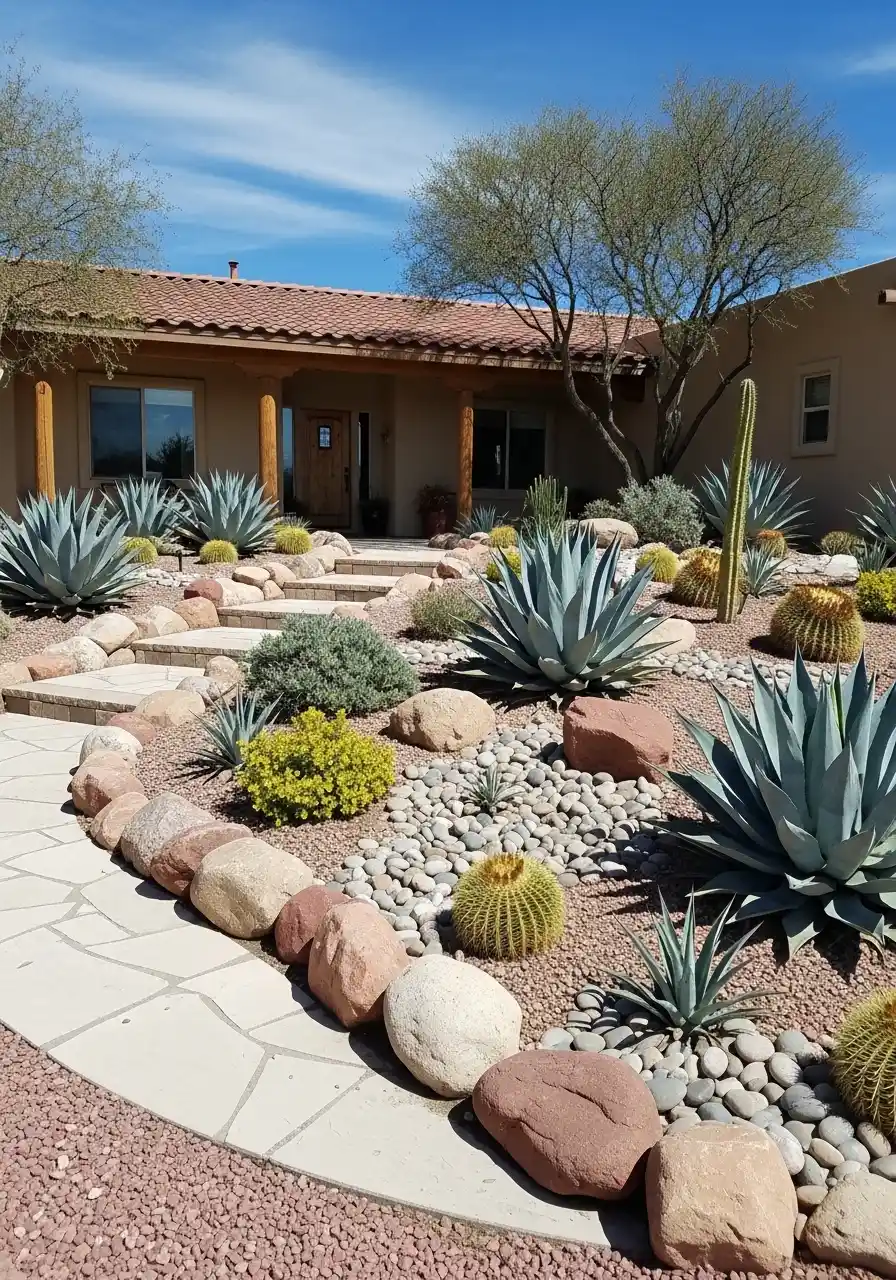 The image feels very rooted in the Southwest, and I mean that in a good way. The curved path, rounded boulders, giant agaves, barrel cactus, and small desert shrubs all come together in a yard that feels both rugged and composed. It looks sun-loving and honest. Nothing here is pretending to be a green lawn estate. It embraces the climate, and I respect that a lot. These kinds of northern nevada desert yard ideas can age beautifully because they belong to the region.