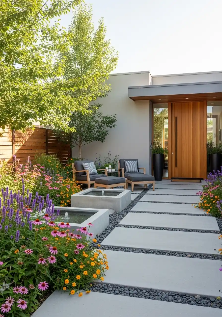 The third image surprised me because it blends water features with a dry-friendly layout in a way that still feels believable. Those square fountains near the chairs make the entry feel peaceful and almost intimate. Then the flowers soften the concrete path and the modern architecture. I know some people hear “water feature” and think it’s a bad fit for the region, but small recirculating fountains are a different story.