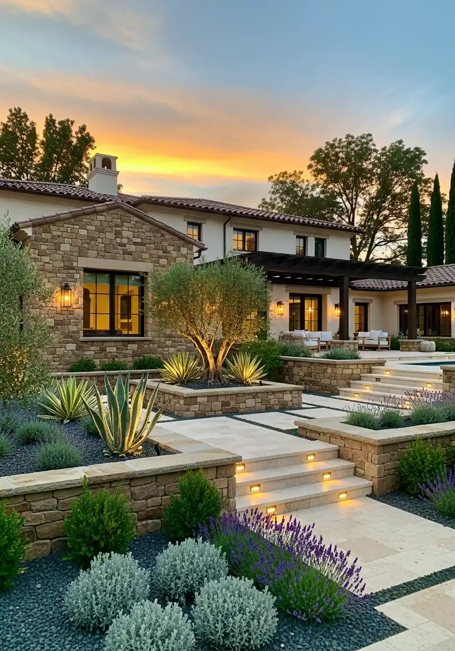 The fourth image feels like a dream, and yeah, maybe a pricey dream, but still useful. The layered stone walls, broad steps, lavender-like plantings, and tucked-in lights all work together to make the space feel settled. What really gets me is the evening glow. Some yards only shine in daylight. This one seems to get prettier when the sun goes down, which honestly is when I’d most want to be outside.