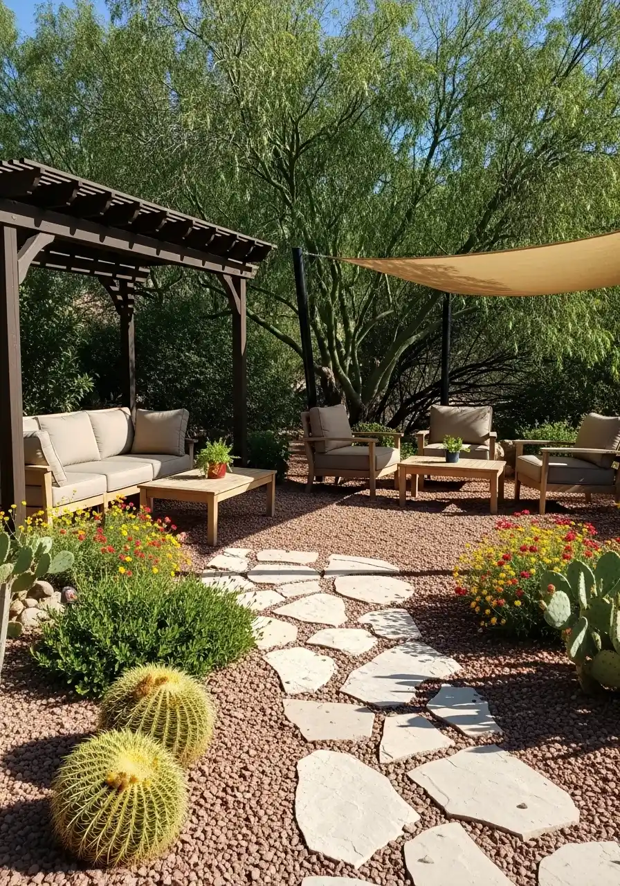 Add shade first. Pergolas, shade sails, or covered patios make a huge difference. Then use gravel, stone, and heat-tolerant plants around the seating zones.