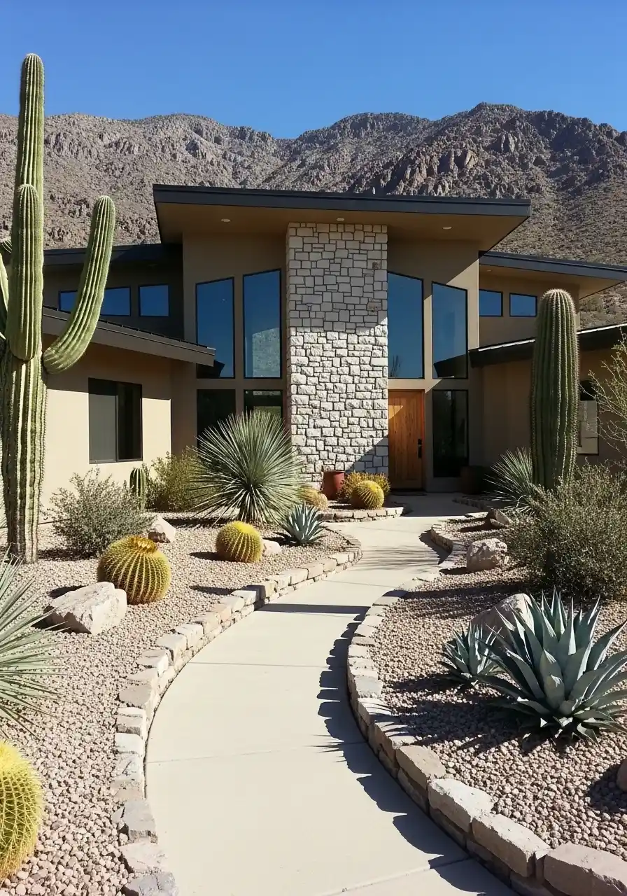 The sixth image has that high-desert confidence I really love. Big saguaros, barrel cactus, agave, pale gravel, and that mountain backdrop create instant drama. What saves it from feeling too severe is the curved walkway and the stone detailing on the house. The entry feels strong, but not unfriendly. I think that balance is harder to pull off than people think.