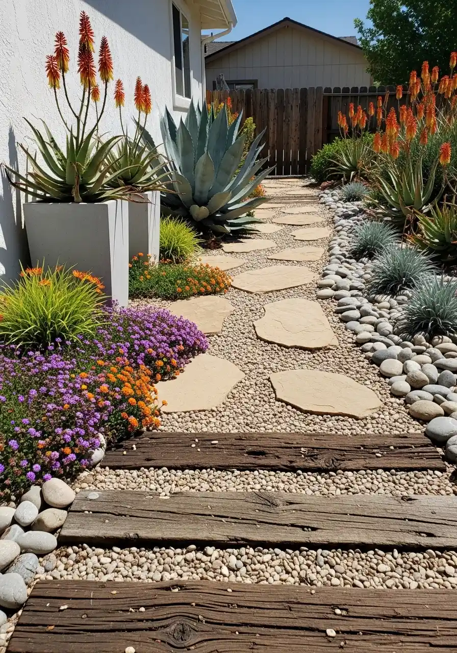 I’m glad one of the images shows a narrow side yard, because that’s where so many people give up. This one uses stepping stones, pebble groundcover, boulders, succulents, and bright flowering plants to turn a pass-through into a real feature. The wood planks at the front add texture too. It’s casual, a little playful, and honestly more charming than some full backyards I’ve seen.