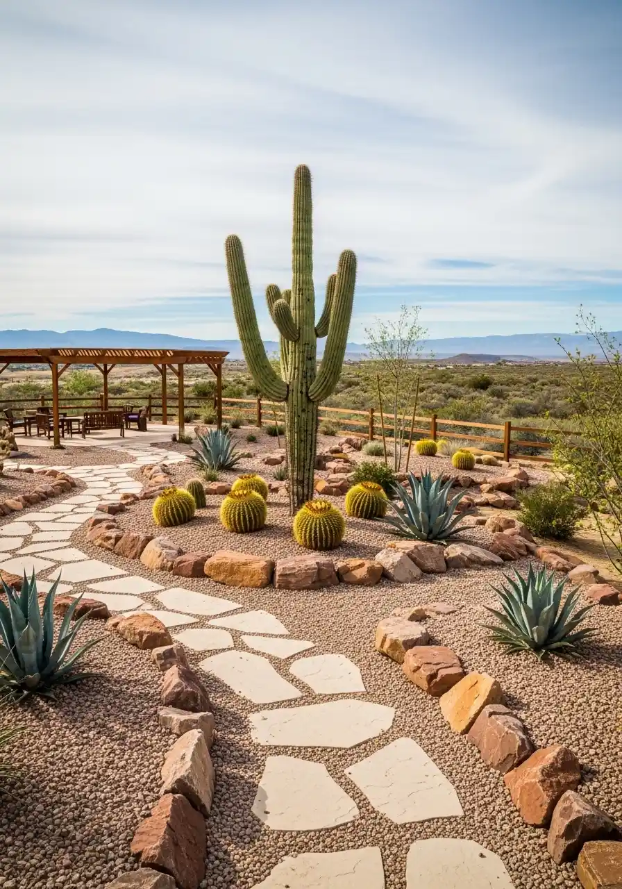 This is one of my favorite northern Nevada landscaping ideas for larger properties because it solves a common problem. Big yards can feel scattered. A central focal bed fixes that. I’d use oversized succulents, a tall vertical cactus shape if climate allows, and repeating barrel cactus or boulders around the base. This is also strong for rock garden ideas northern Nevada homeowners can adapt on a smaller scale. The magic is in the composition. One strong center, repeated forms, and paths that feel natural.