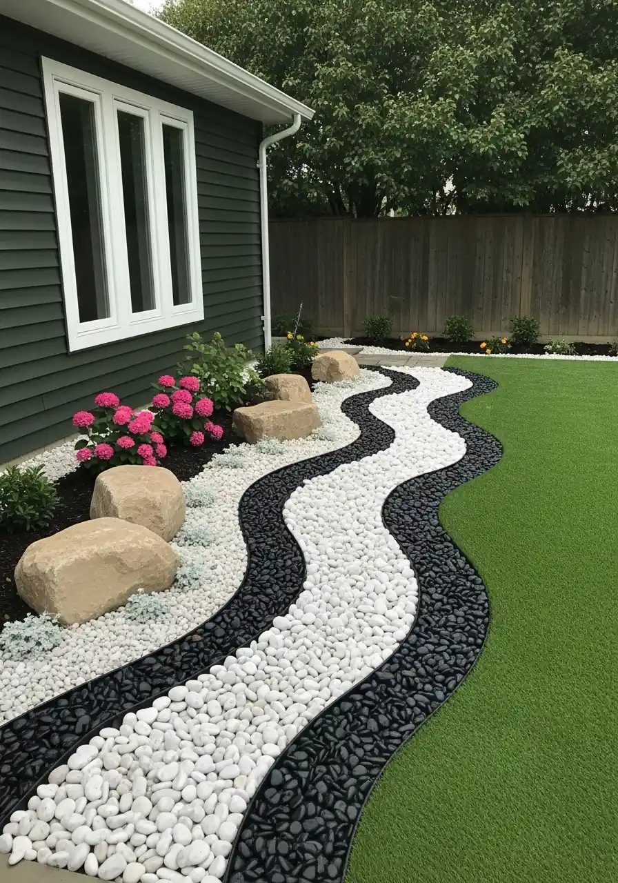 This one is straight-up dramatic. The border is a bold wave of white stones with a black pebble strip on each side. It’s like a path made of zebra stripes, but classy. This pebbled garden edging is for people who want the yard to look designed, not just planted.