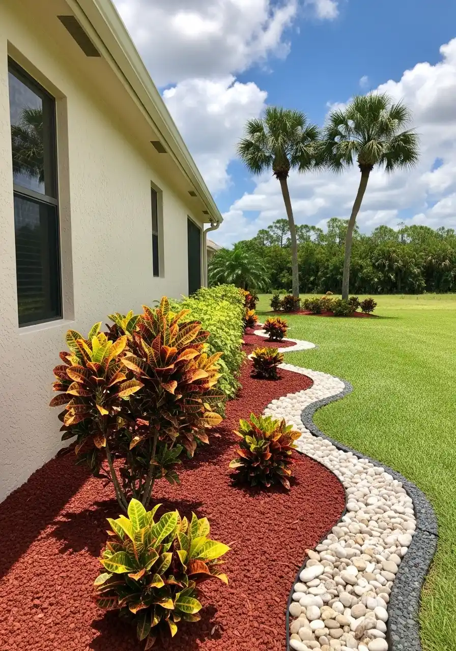 This one is hot weather energy. Red mulch, bright green lawn, and colorful shrubs like crotons. The white pebble border curves along the bed like a bright outline, almost like chalk. It makes the whole thing look crisp.