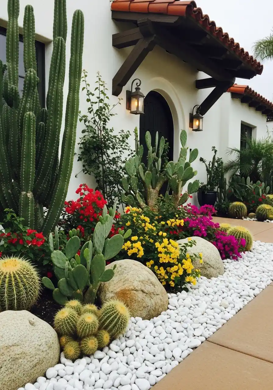 This one is such a cool mix. You’ve got white pebbles like a clean blanket, then cacti and succulents with bright red, yellow, and pink flowers popping out. It’s like a desert garden that decided to be cheerful. A pebble border garden works great here because pebbles match that dry-land look and help with drainage.