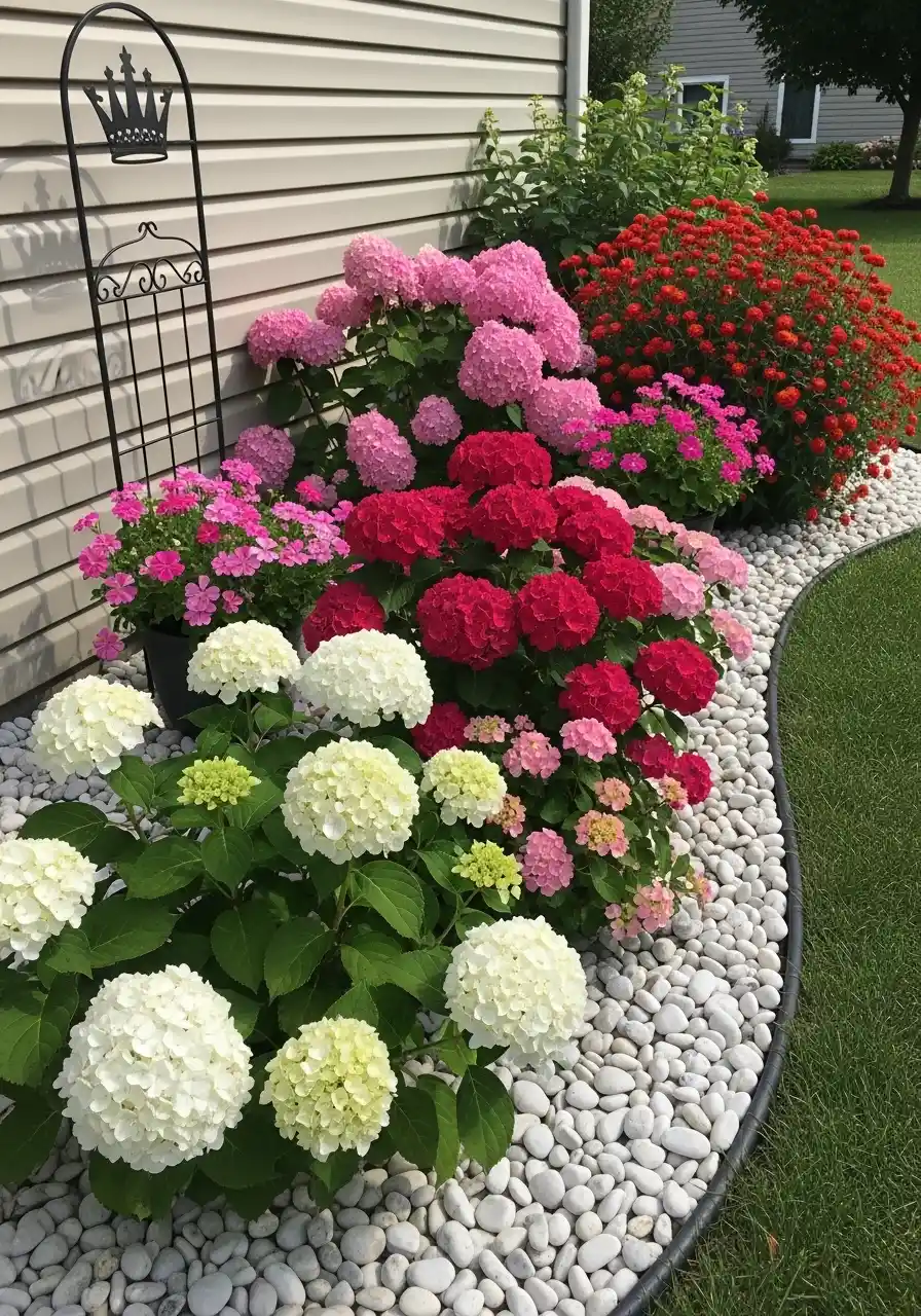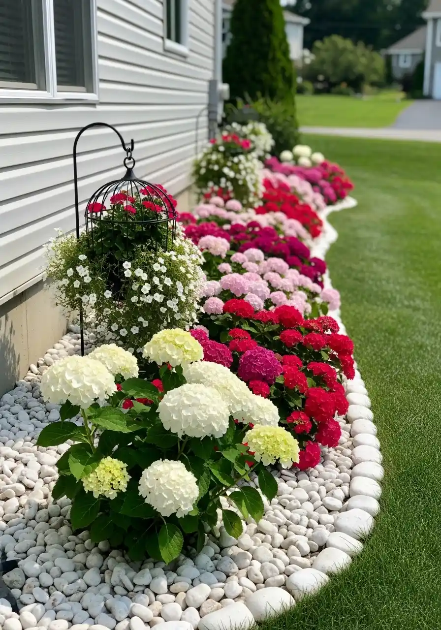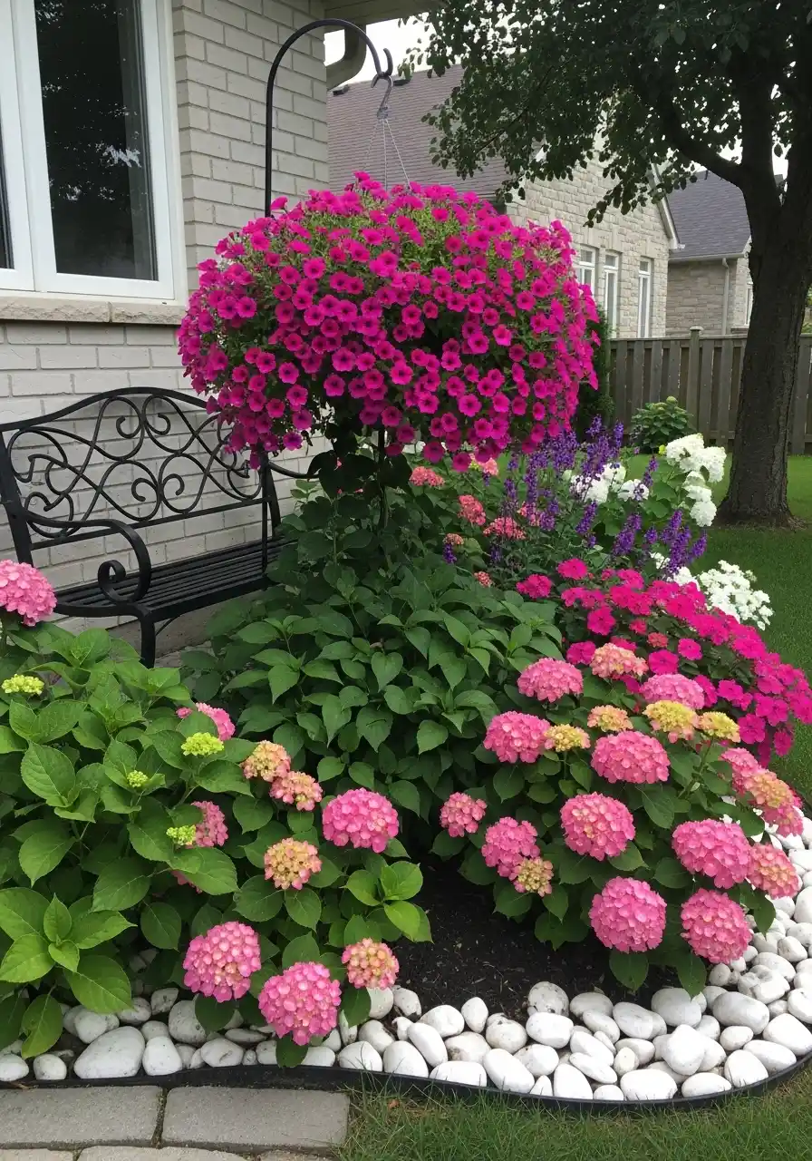 This one feels sweet and cozy, like a garden you sit beside with iced tea. There’s a clean white pebble edge, then hydrangeas in soft pinks and whites, plus a hanging basket that looks like a floating flower lamp. The pebble border garden here makes the whole bed feel tidy, even though the plants are lush.