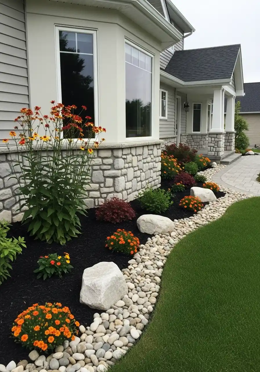 This next idea is a smaller front bed by a porch and brick path, and it still looks fancy because the border is clean. The pebble strip hugs the planting curve perfectly, and the flowers are placed like little bursts of color. It’s proof you don’t need a giant yard to make a statement.