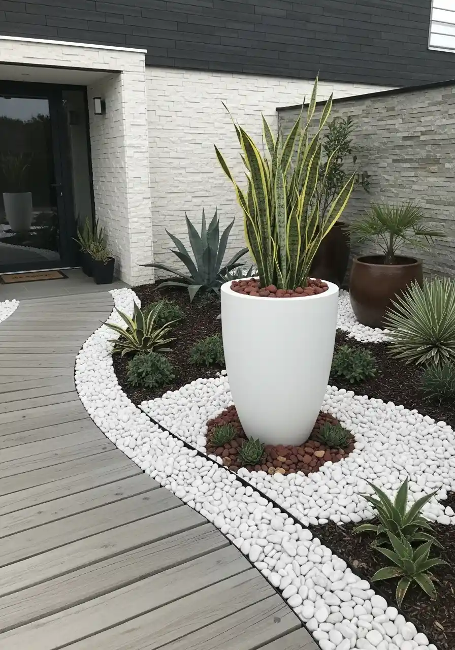 This garden pebble border idea feels super clean and calm. White pebbles everywhere, dark mulch patches, and bold plants like agave and snake plant. The giant white pot in the center makes it feel like a modern front entry, not just “some plants.”