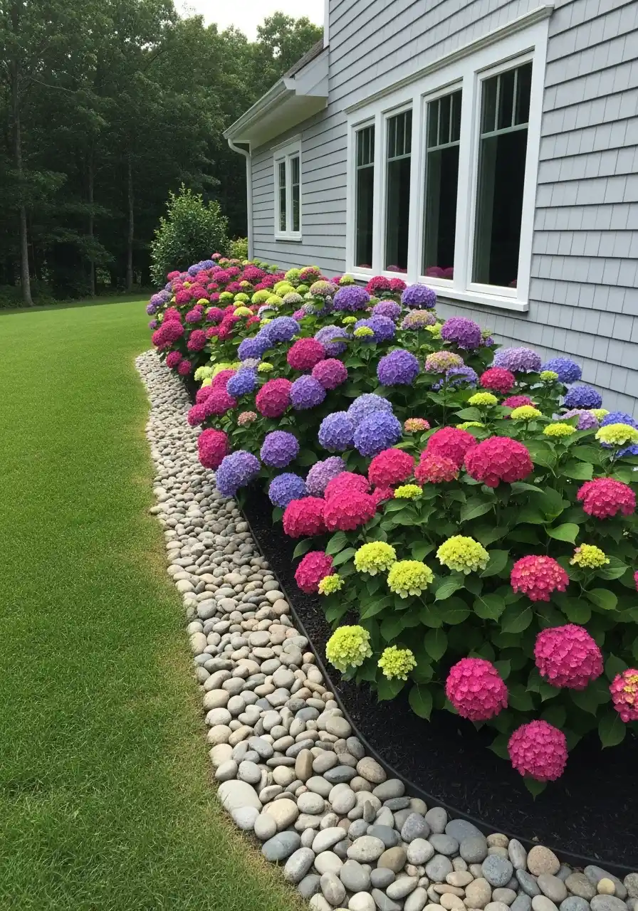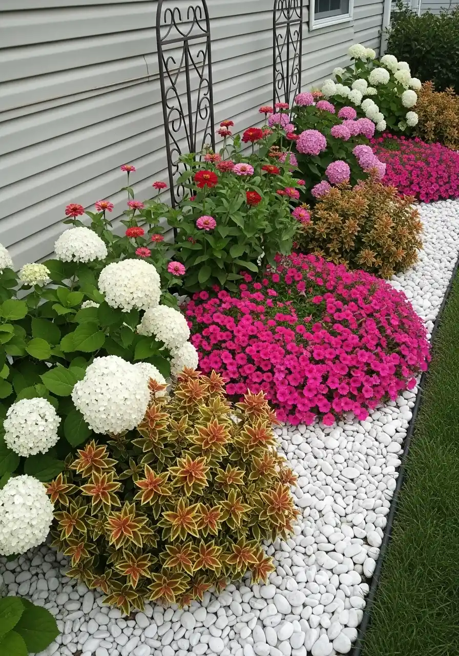 This is the tidy one along the side of a house. Hydrangeas, zinnias, and bright groundcovers, all repeating in a pattern. The white pebbles run like a clean strip beside the plants, and it makes everything look trimmed even if the plants are kinda wild.