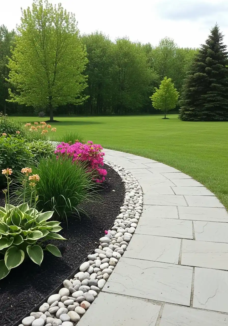 To pull it off, be strict about spacing. Repeat the same plant groups every few feet. It sounds boring, but it looks amazing. Also, don’t skimp on the pebble width. A wider border keeps grass from creeping in as fast. Grass is sneaky, it always tries.