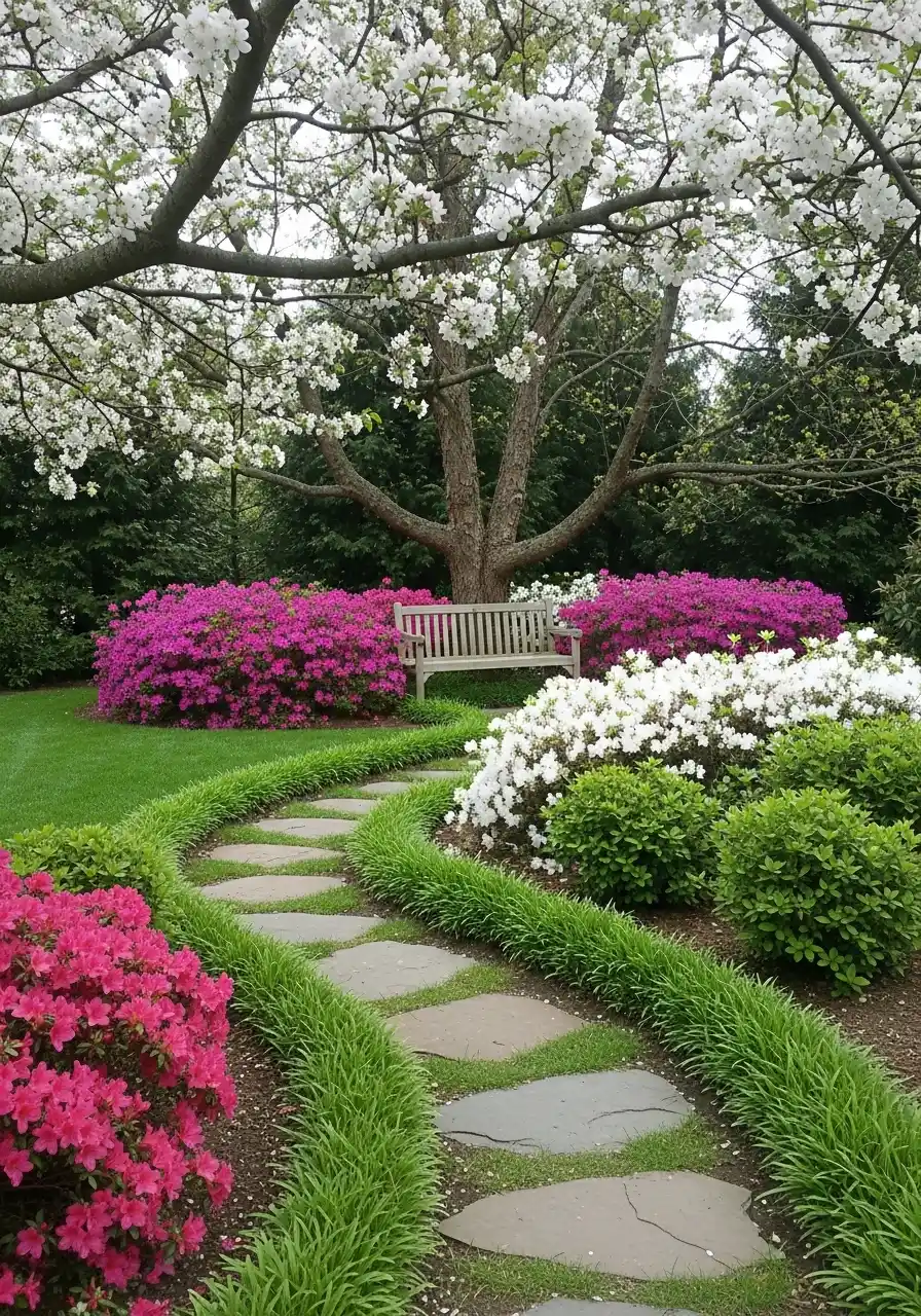 This next idea feels like a painting. A bench under a flowering tree, surrounded by bright shrubs, makes shade feel romantic instead of dull. In shaded backyard landscaping, flowers can be tricky because some bloomers want sun, but you can still get big color if you plan it right.