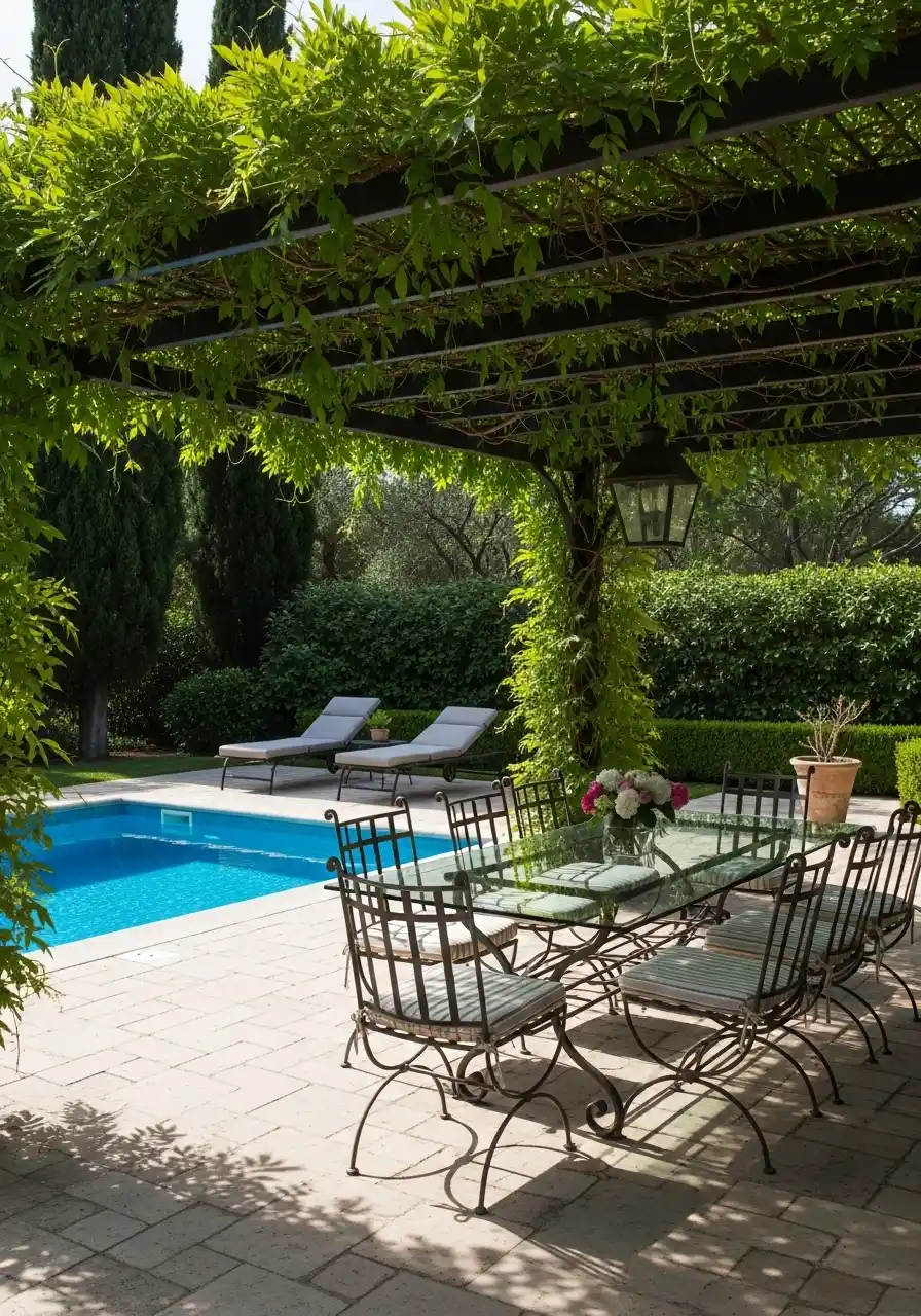 This setup is basically a green ceiling. The pergola has thick vines draping over the beams, so the sunlight turns into soft, moving patches on the patio. I love how the pool water looks extra blue under the shade, like it’s glowing a bit. And the outdoor dining table sitting under all that leaf cover feels like lunch in a secret garden, not just “table outside.”