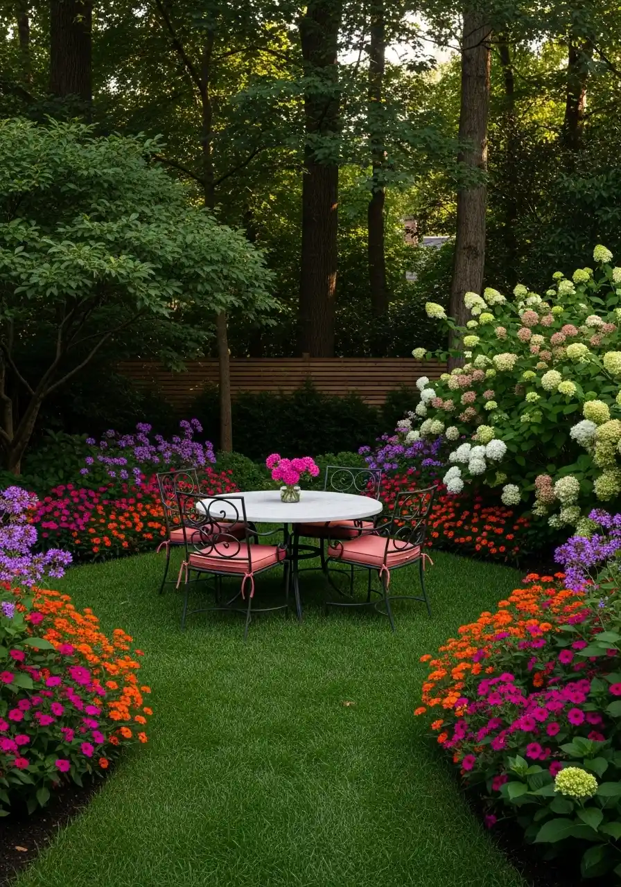 This garden is loud in the best way. A small round table sits in the middle, and everything around it is color packed: bright pinks, oranges, purples, and those big hydrangea blooms that look like fluffy clouds. It’s still shade-friendly backyard landscaping, but it doesn’t feel dark at all because the flowers do the cheering-up part.