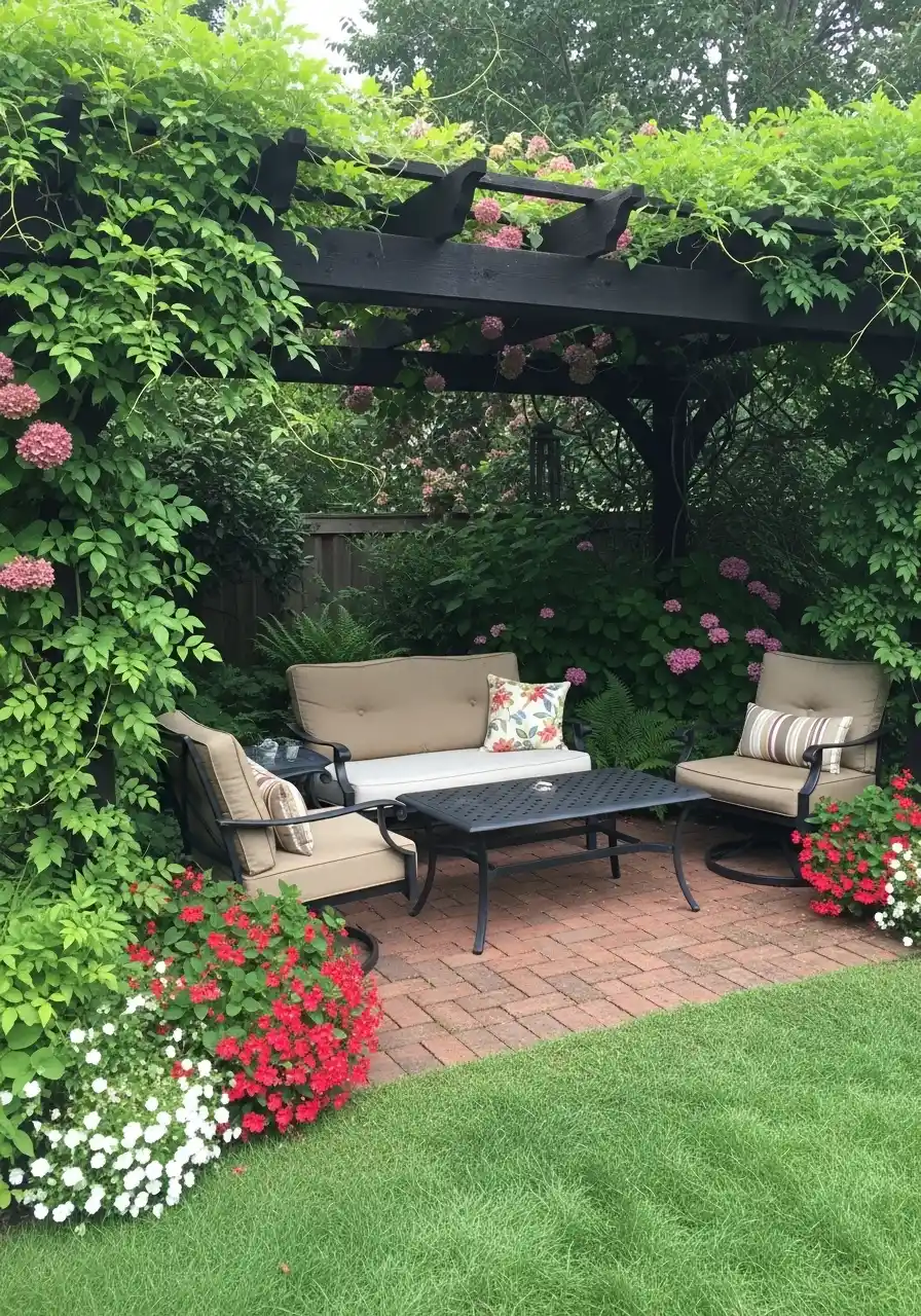 This one feels like a backyard living room hiding in the plants. Dark pergola beams overhead, thick green vines climbing the sides, and then soft beige seating on a brick patio. The pink hydrangeas popping in the background make the whole shady backyard landscaping vibe feel romantic, not like “oops, the sun never hits here.”