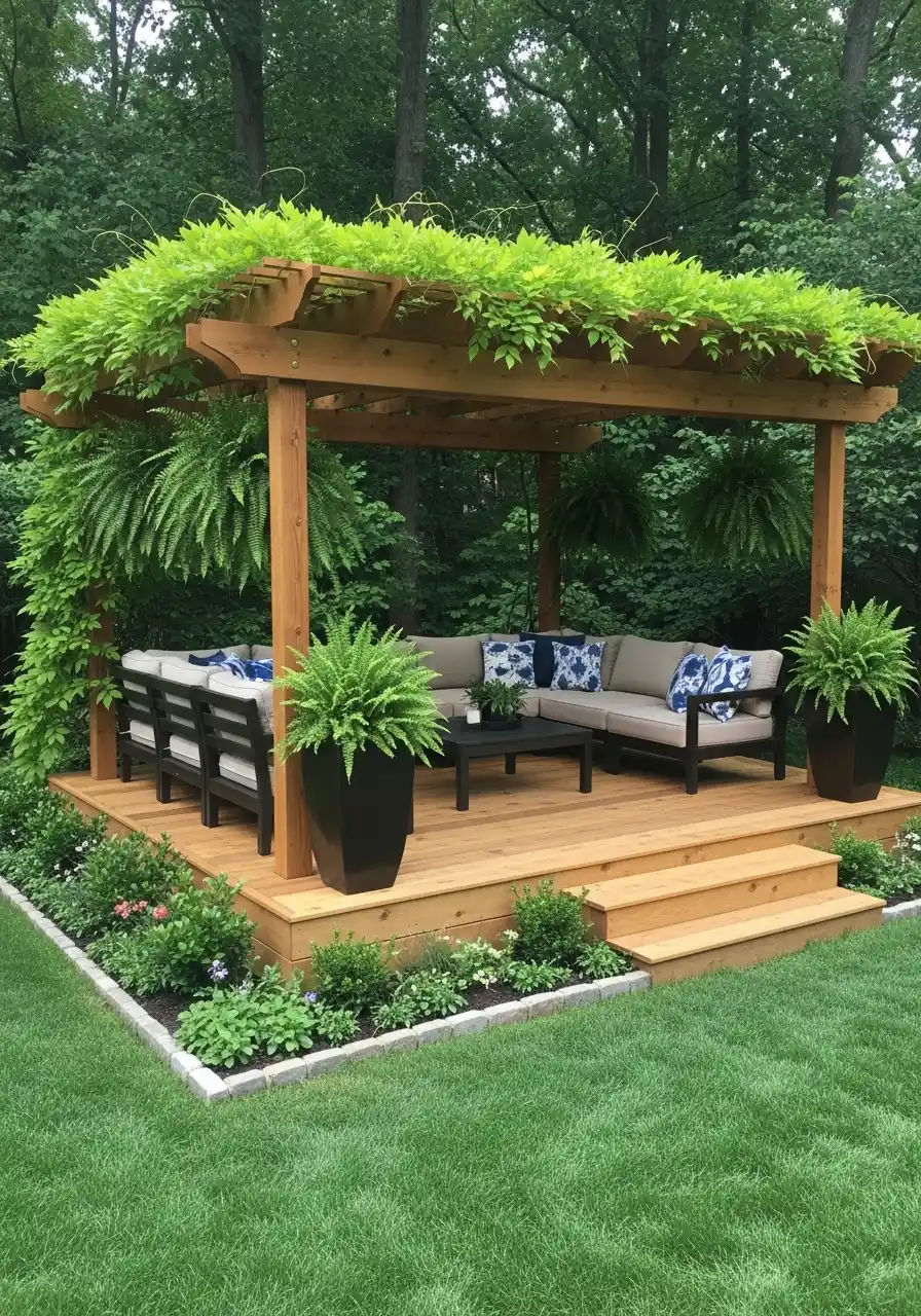 This setup is a mini stage in the yard, and I mean that as a compliment. A wooden platform with steps, a pergola roof covered in green growth, and big black planters with ferns. It’s giving “outdoor lounge” but still fits a wooded, shady backyard landscaping setting.