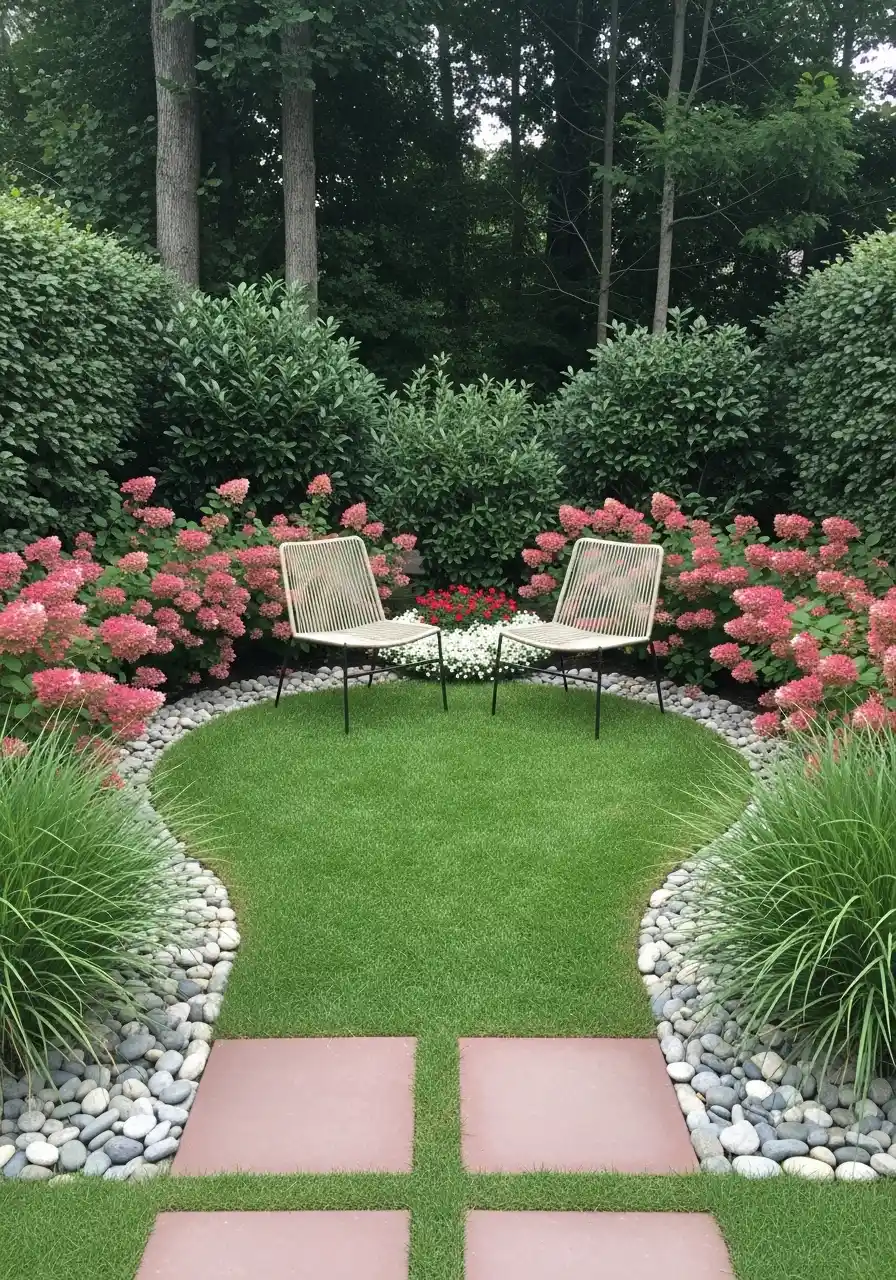This last one is simple and quiet, and I weirdly love it most. Two chairs facing each other, a rounded patch of grass, and smooth river rocks outlining the space. Pink hydrangeas wrap the back like a soft wall, and the tall shrubs and trees make it feel tucked away. This is shaded backyard landscaping for people who want calm, not a party.
