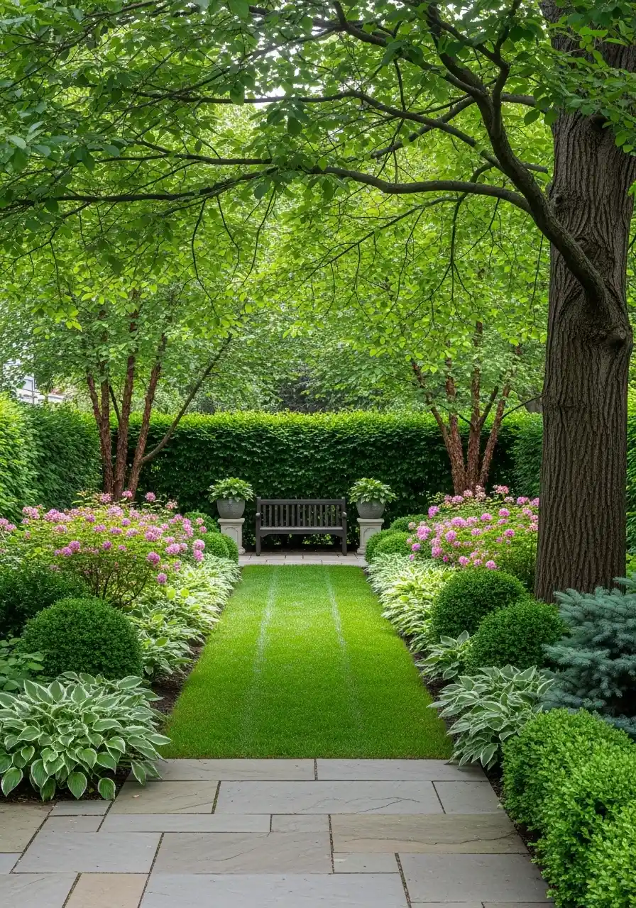 This design feels like a deep breath. A centered strip of lawn leading to a bench, with layers of plants on each side, looks organized without being boring. In shaded backyard landscaping, structure is your friend because shade can make plants blur together if you don’t guide the eye.