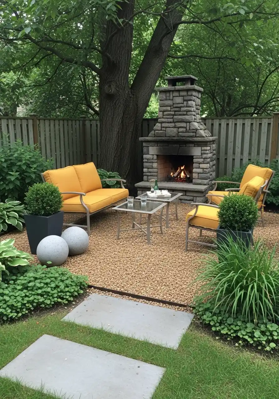 What I like here is the gravel base. It drains well, it’s low maintenance, and it makes the fireplace look grounded. Then you add comfy chairs with bright cushions (yellow is bold but happy), and suddenly it feels like an outdoor living room. Big planters with round shrubs add balance, and they keep the space from feeling empty.