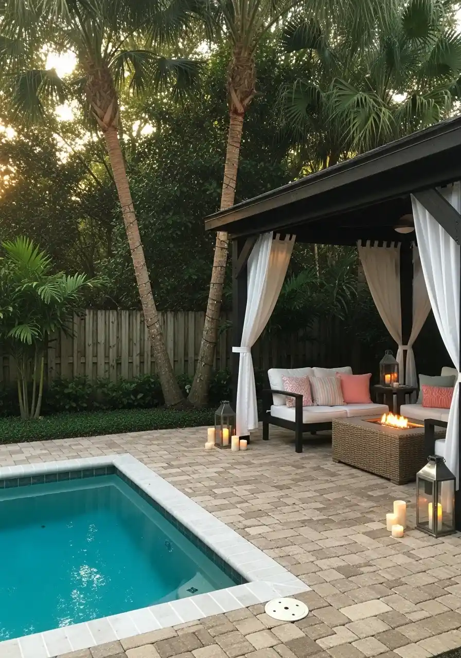 This one is pure mood. A dark cabana frame with light curtains makes the pool area feel like a resort, even if you’re in a normal neighborhood. In shaded backyard landscaping, fabric is a sneaky tool because it softens harsh lines and it moves in the breeze.