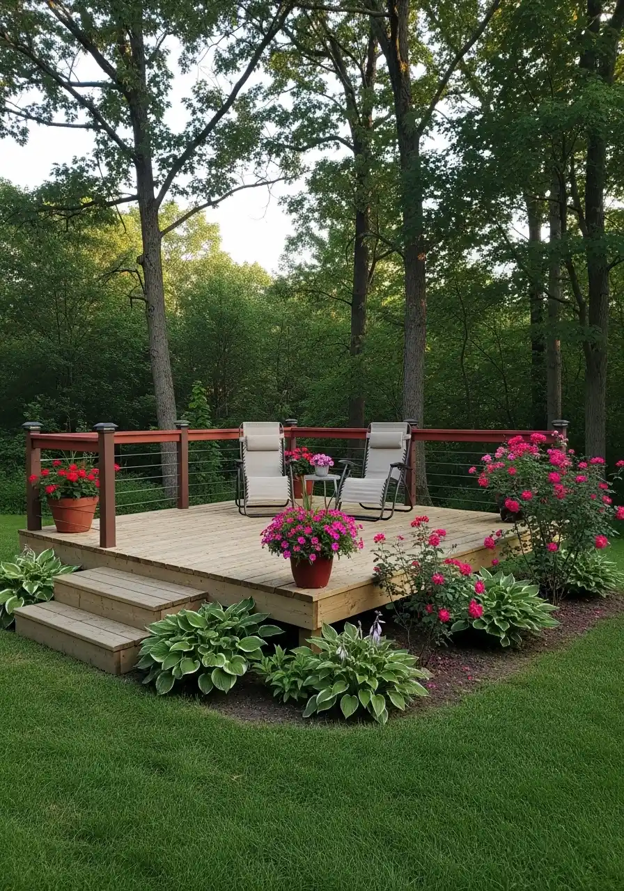 I’d add loungers or simple chairs, and keep decor minimal. Let the trees do the heavy lifting. Planters with bright flowers at the corners make it feel friendly, not like a plain stage. Also, steps matter. Wide steps feel safer and more welcoming, especially if kids or older family visit.