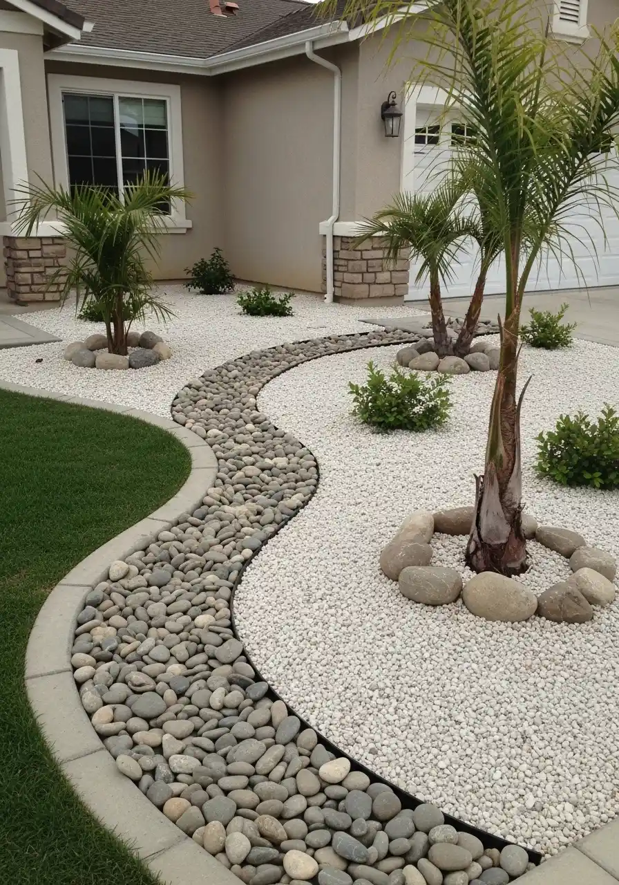 If you want this, the trick is contrast. Use two rock colors that are clearly different, and keep the river rock “stream” wide enough to read from the street. Edge it so the rocks don’t blend together over time. Plant small shrubs in groups of three so they don’t look lonely.