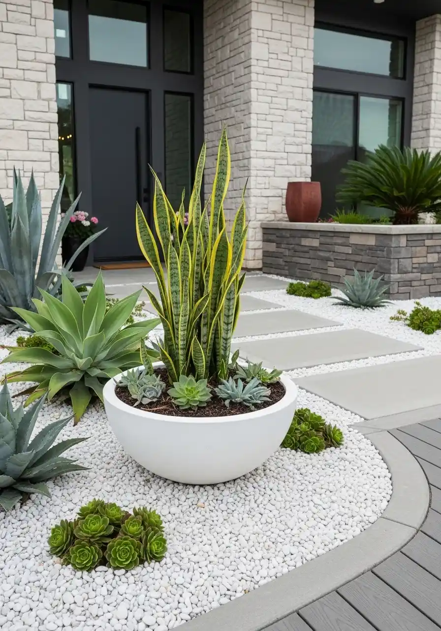 This setup is so crisp it almost feels fake. White pebble ground, big modern pavers, and that smooth bowl planter sitting there like it owns the place. I love how the tall snake plant shoots up like green fireworks, and the smaller succulents around it make the pot look full without being messy. For southern california landscape ideas, this is one of my favorites because it’s low-stress and still looks fancy.
