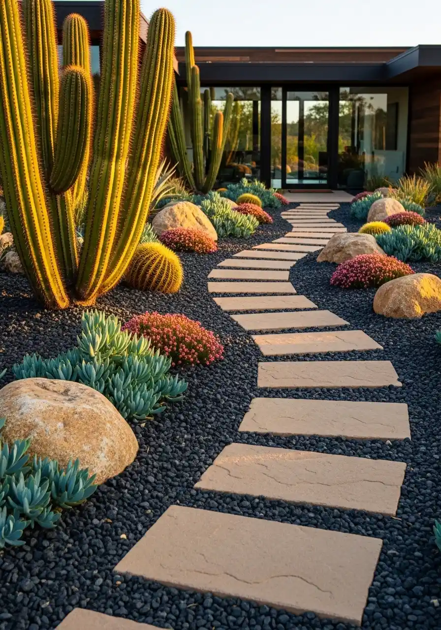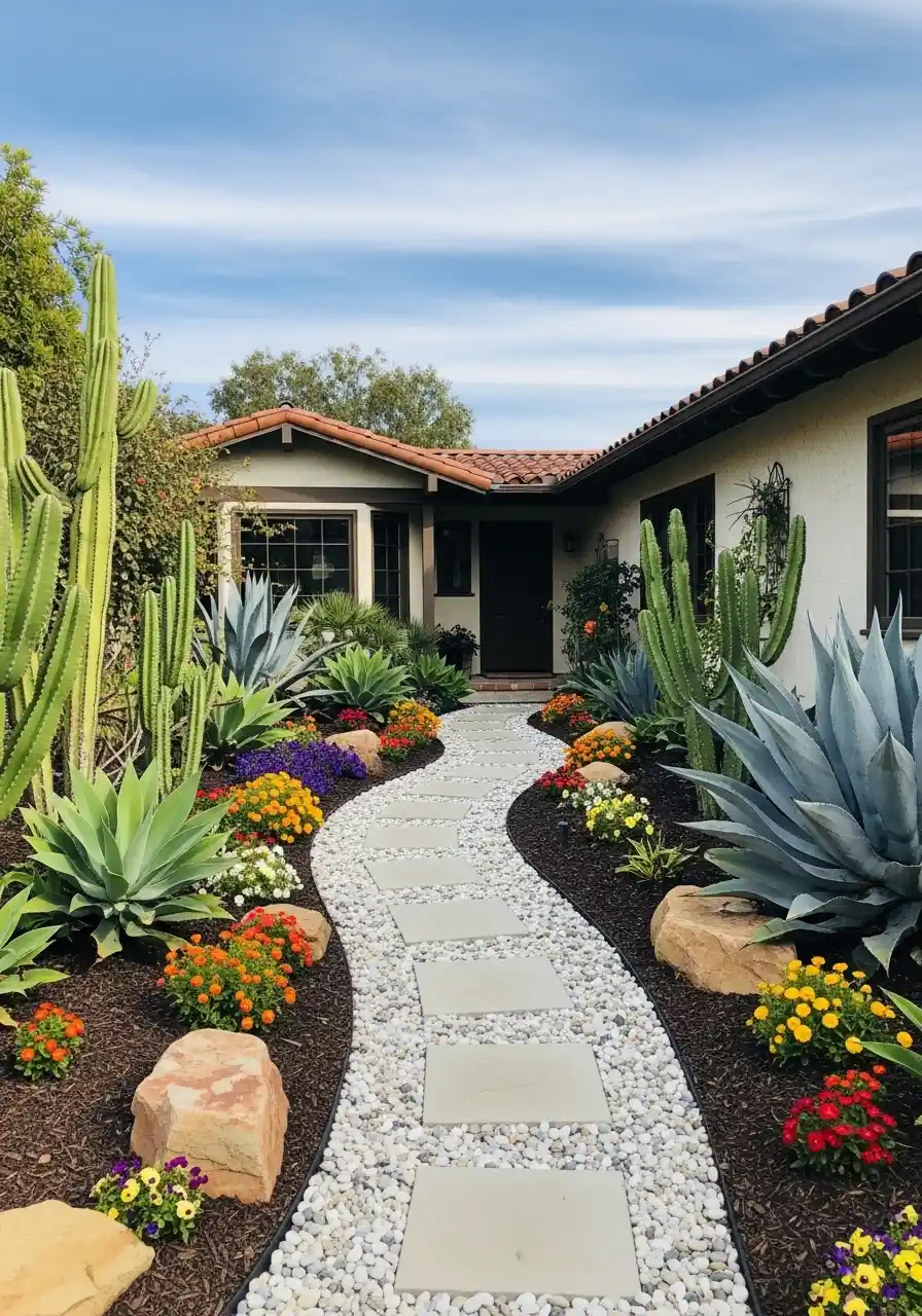 This is the “wow, that’s a statement” yard. A curved path of pavers runs through a bed of white rock, and on both sides you get tall cactus, huge agaves, and pops of flowers tucked low. The dark mulch edges frame the whole thing and keep it from looking too bright. It’s symmetrical-ish, but still relaxed.