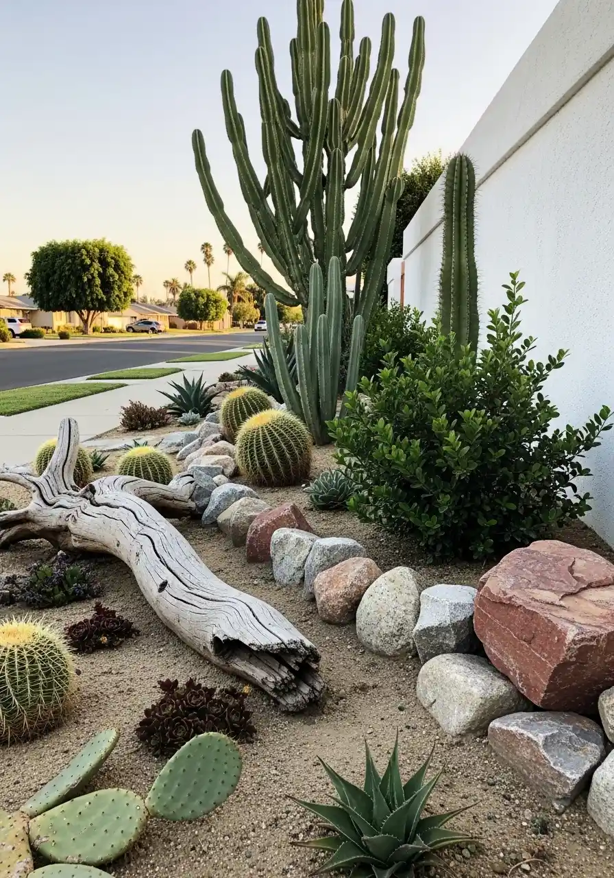 This side yard idea feels wild in a quiet way. The big driftwood log is such a weird choice, but it works. It makes the whole space feel like a little desert scene you found on a hike. The boulders lined up like a loose border are also smart because they look natural, not like a perfect brick wall. For southern california landscape ideas, this one is for people who want character, not just clean lines.