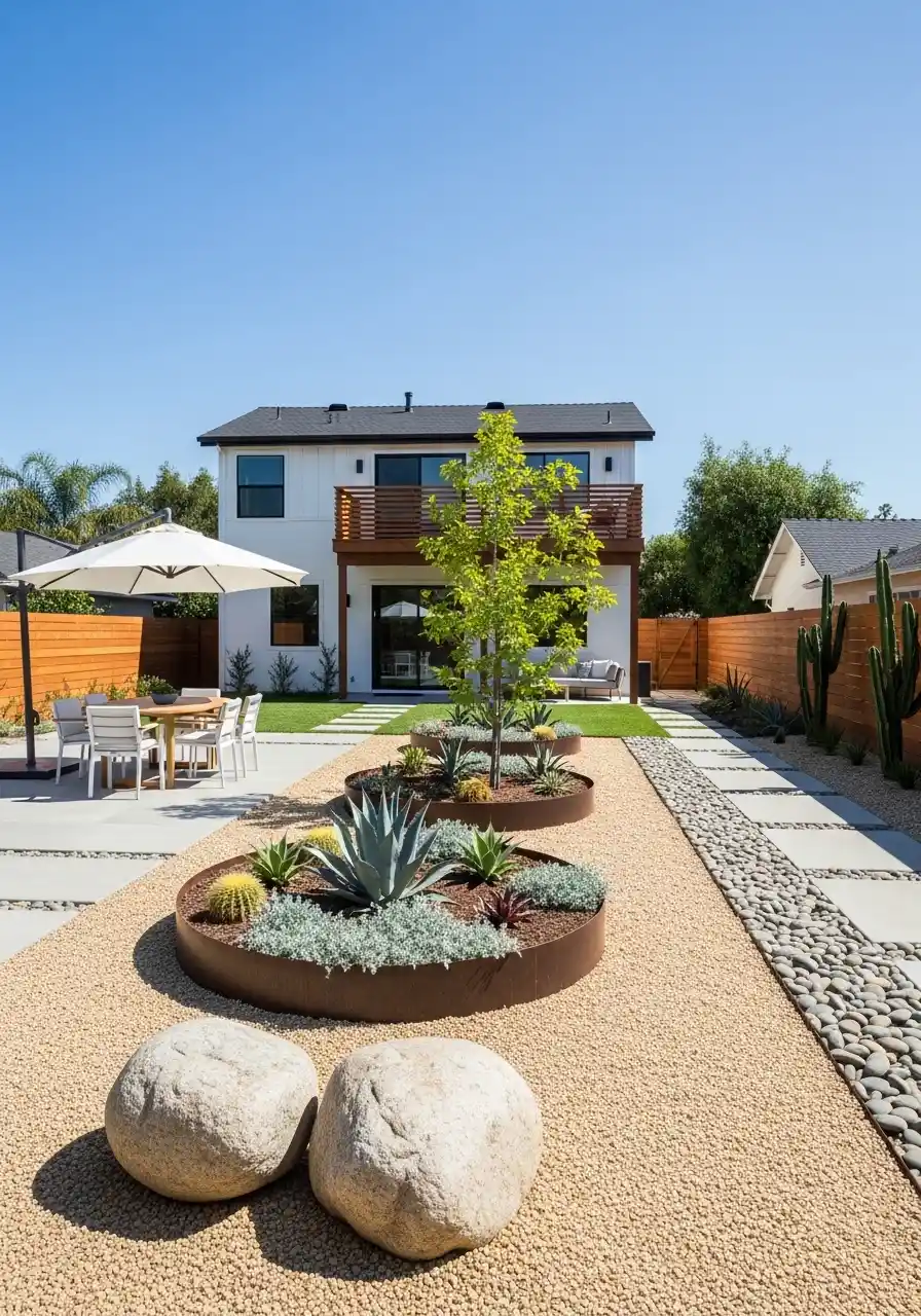 This last yard layout is so organized, it makes my brain relax. The circular raised planters break up the space, and the gravel path keeps it easy to walk through without mud. There’s even a little lawn area, which I normally complain about, but here it’s like a soft “rest spot” for your eyes. For southern california landscape ideas, this is great if you want a modern yard that still feels friendly.