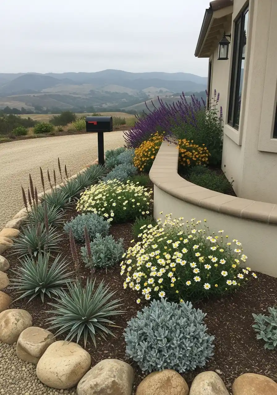 This one feels like a soft garden hug, even though it’s still water-wise. There’s a curved low wall, and the plants flow along it like they’re spilling over. White daisies pop like little fireworks, purple salvia stands tall, and the agaves add that stiff spiky structure so it doesn’t look fluffy and messy. The mulch is dark, which makes the flowers brighter. It’s such a smart contrast trick.