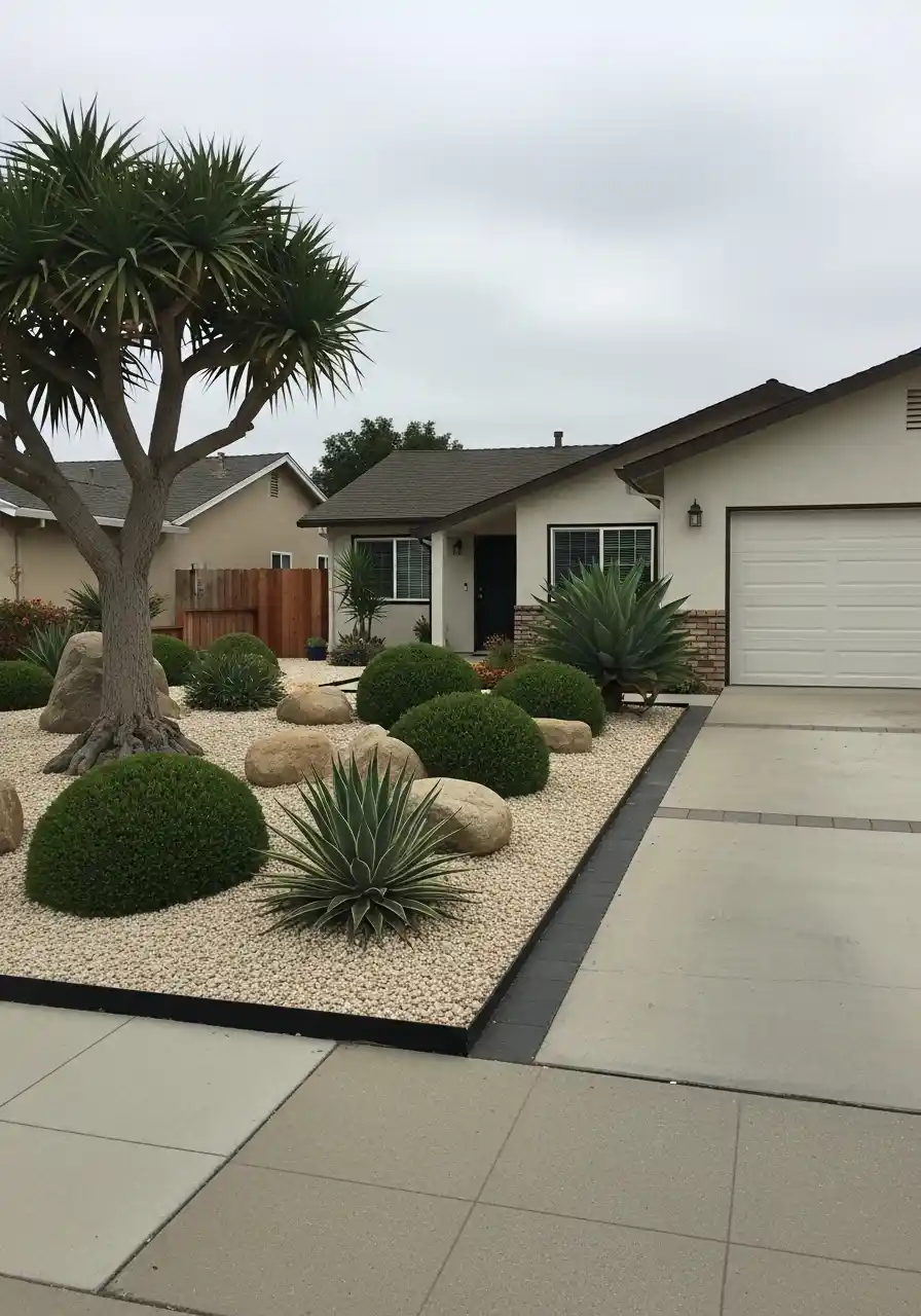 If you’re trying to copy this for SoCal yard ideas, the key is repetition and restraint. Repeat the same round shrub shape at least 5–7 times so it feels like a pattern, not random. Place boulders in different sizes, but don’t line them up like soldiers. Let them look “accidental” but still balanced.