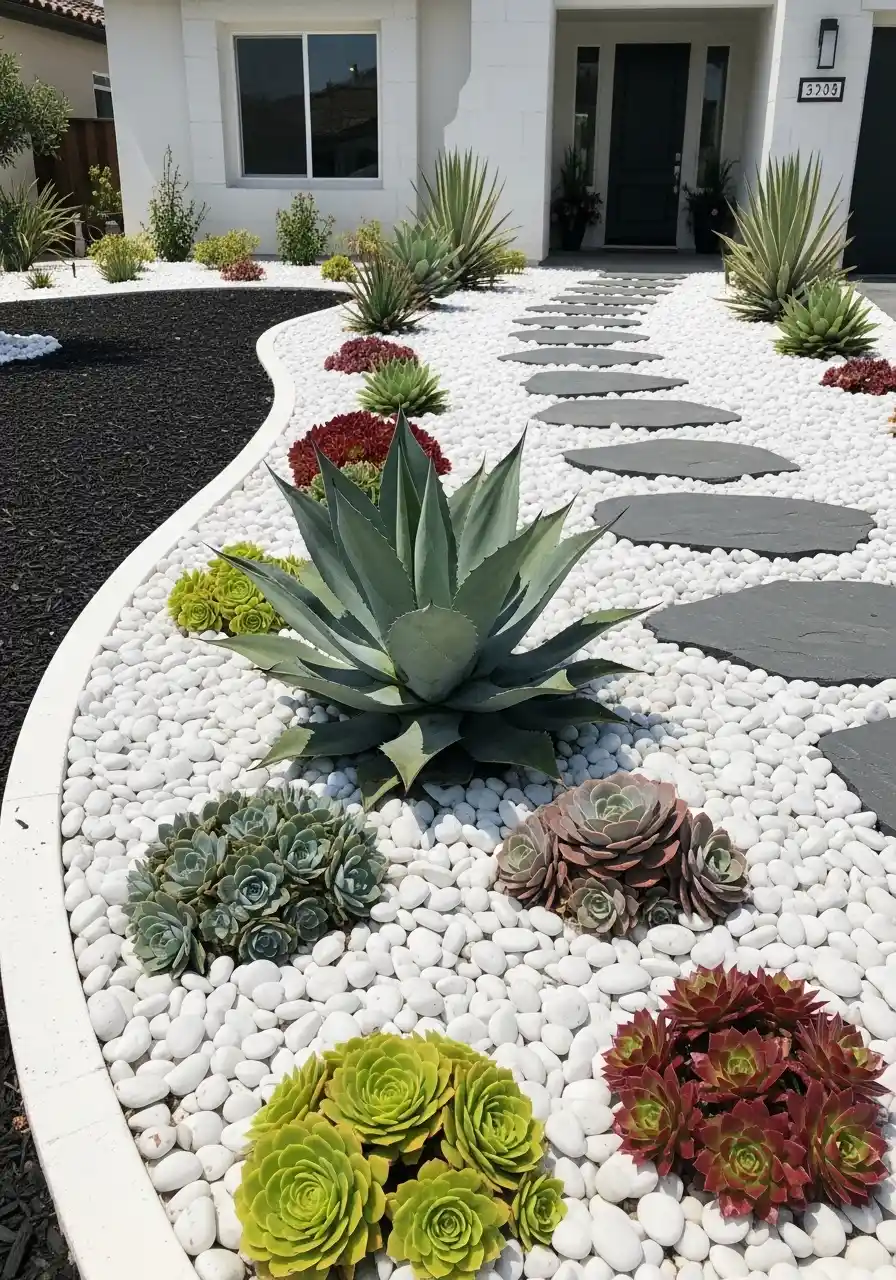 This one is like modern minimalism but still playful. White rock everywhere, big stepping stones floating through it, and then bold succulents placed like sculptures. There’s a big agave up front that steals the show, plus clusters of colorful rosette succulents that add red and lime green. I like how the black mulch section on the side gives the eye a break from all the white.