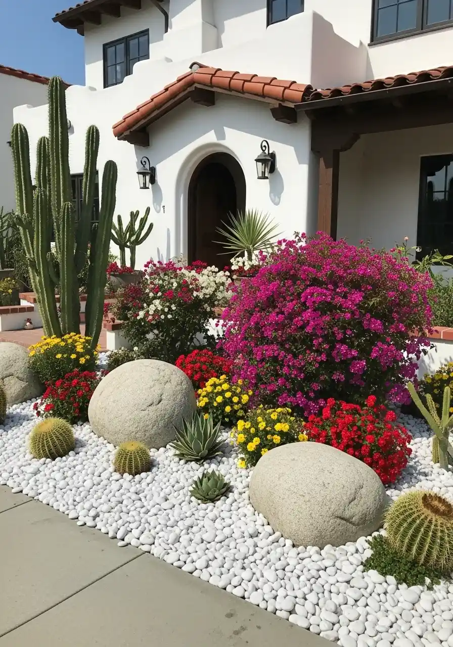 This one is joyful and loud, like it’s wearing lipstick. White rock base again, big boulders, barrel cacti, tall column cactus, and then these bright flowers going pink, red, yellow. The house is Spanish-style, so the color makes sense. It feels festive, not random.