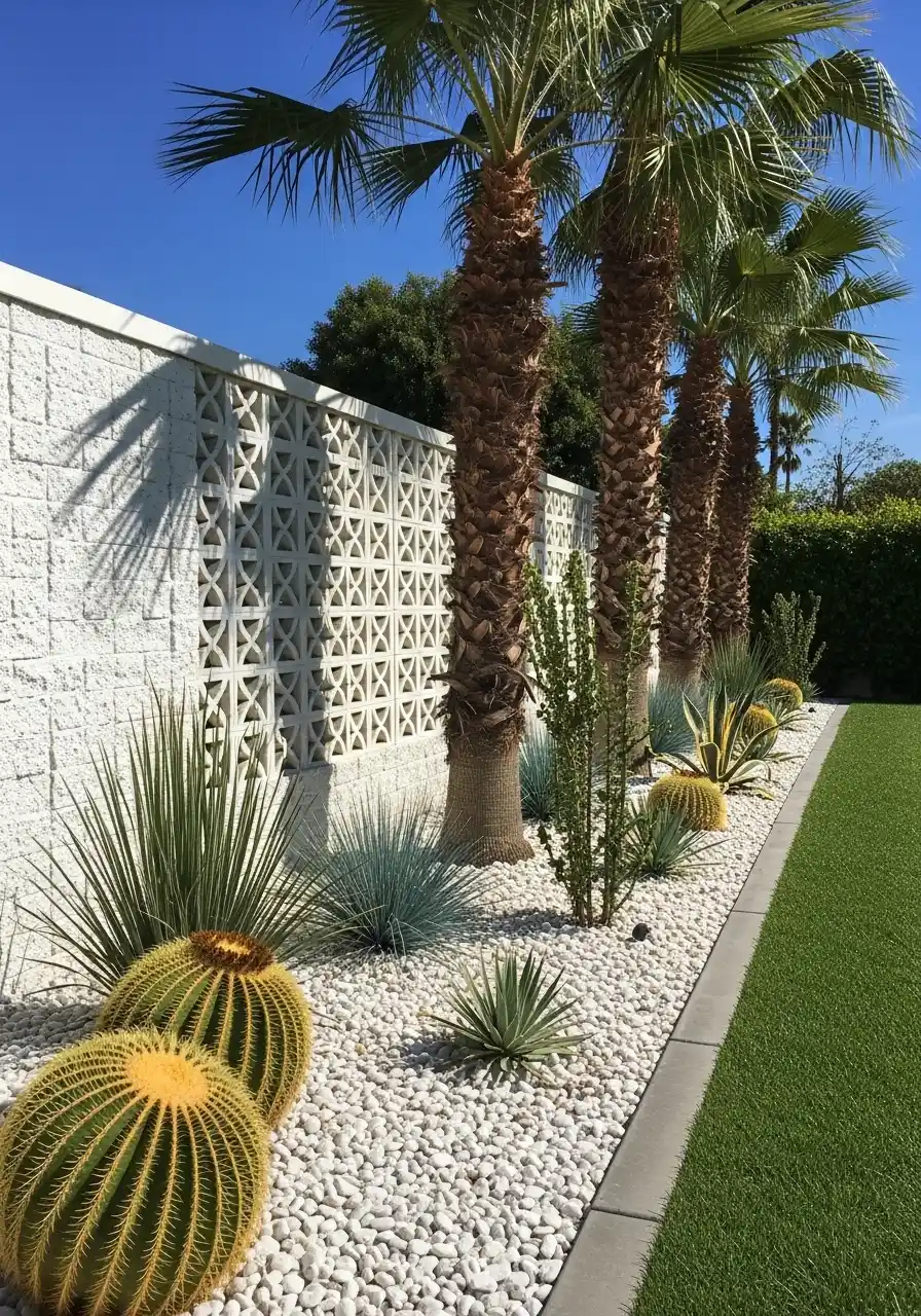 This one feels very mid-century SoCal. A patterned block wall, palms lining the bed, and then white rock with barrel cacti and spiky plants scattered in. The plants are spaced wide, so it feels clean. And the palms throw shadows that make everything look alive even when the plants aren’t flowering.