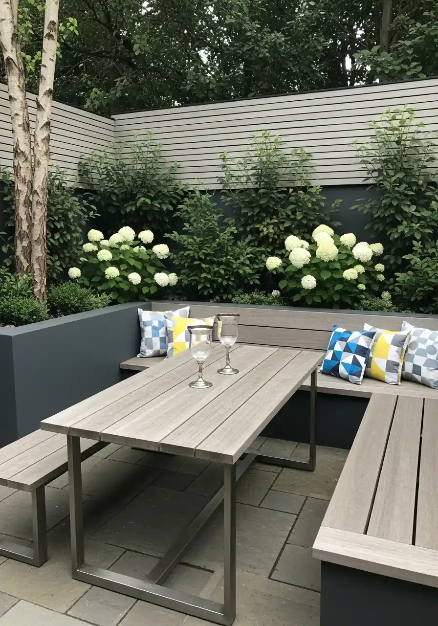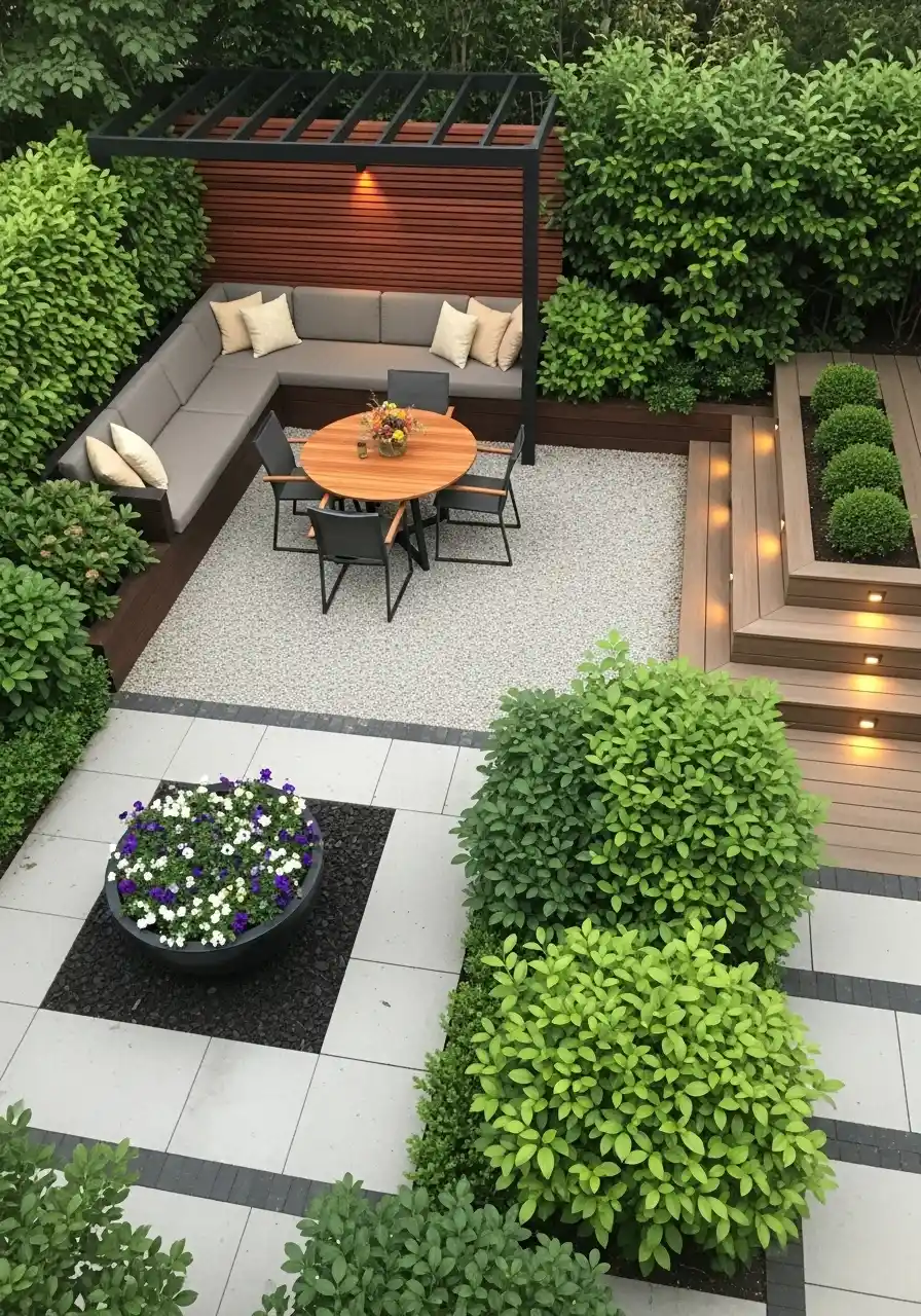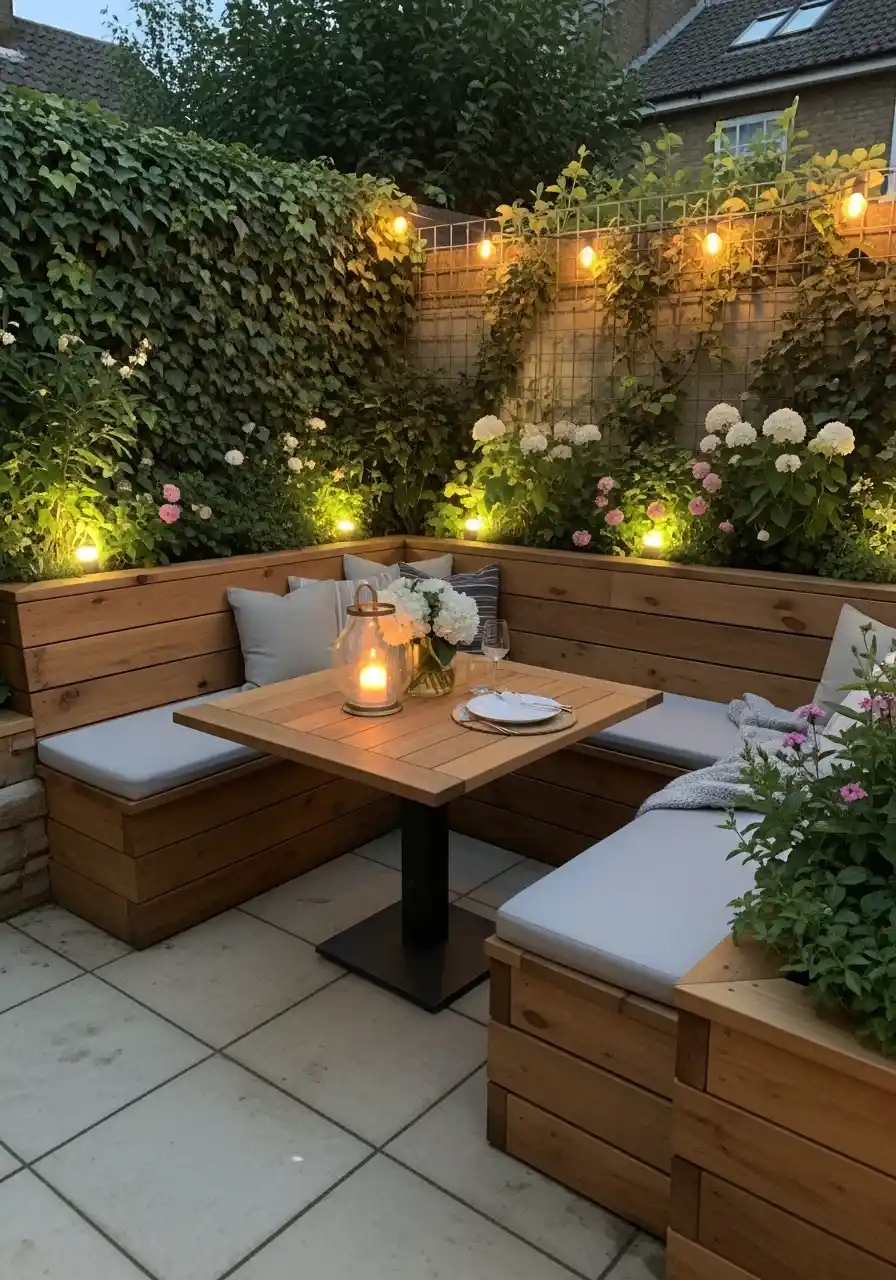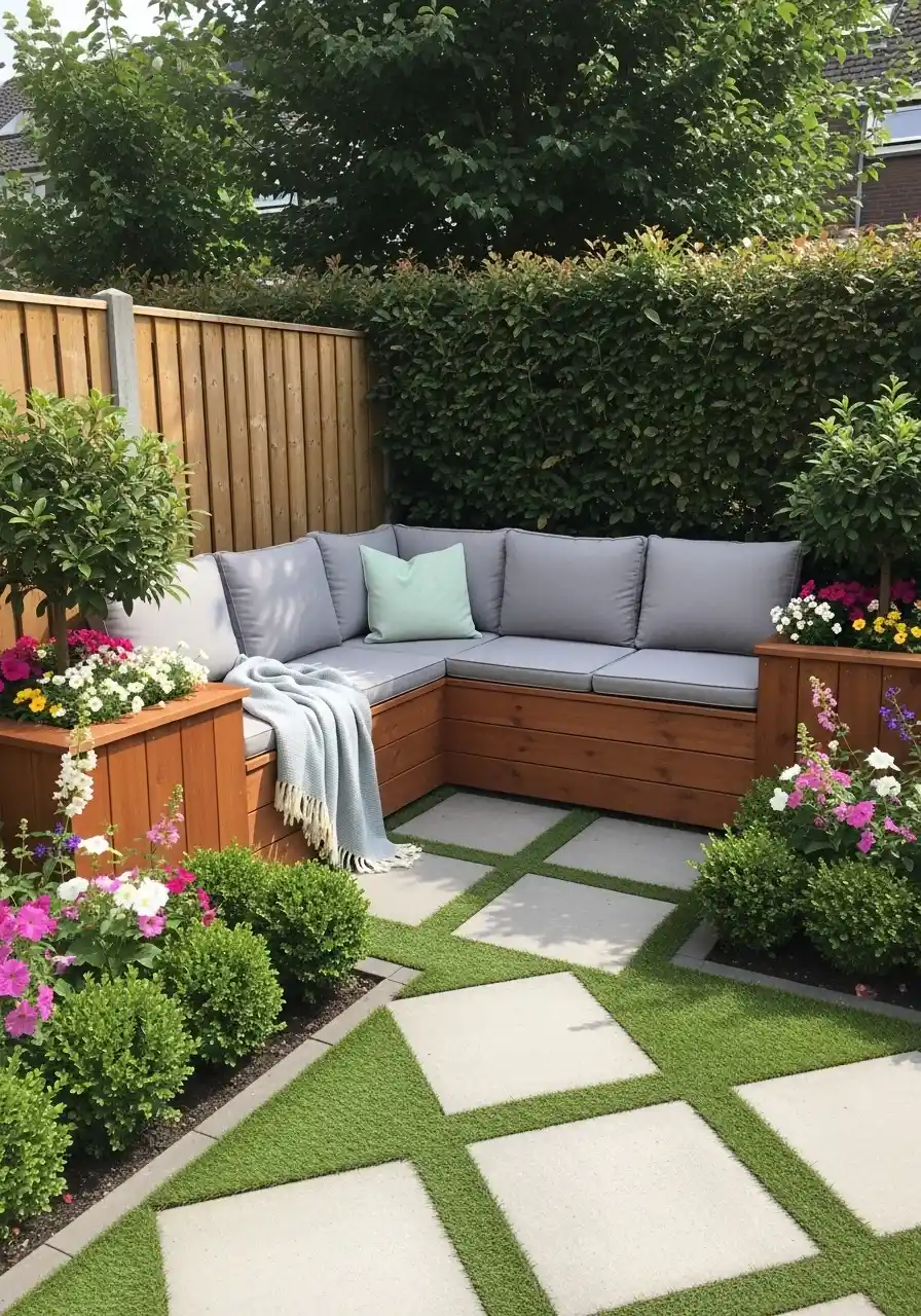 Here’s how to make it work: build the seating right along the edges, then add planter boxes as the “arms” of the seating. Use flowers or small shrubs in the planters so it feels lush without being messy. Also, under-seat storage is a sneaky bonus. If you’re working with a square backyard layout idea, storage matters because clutter shows more in smaller spaces.